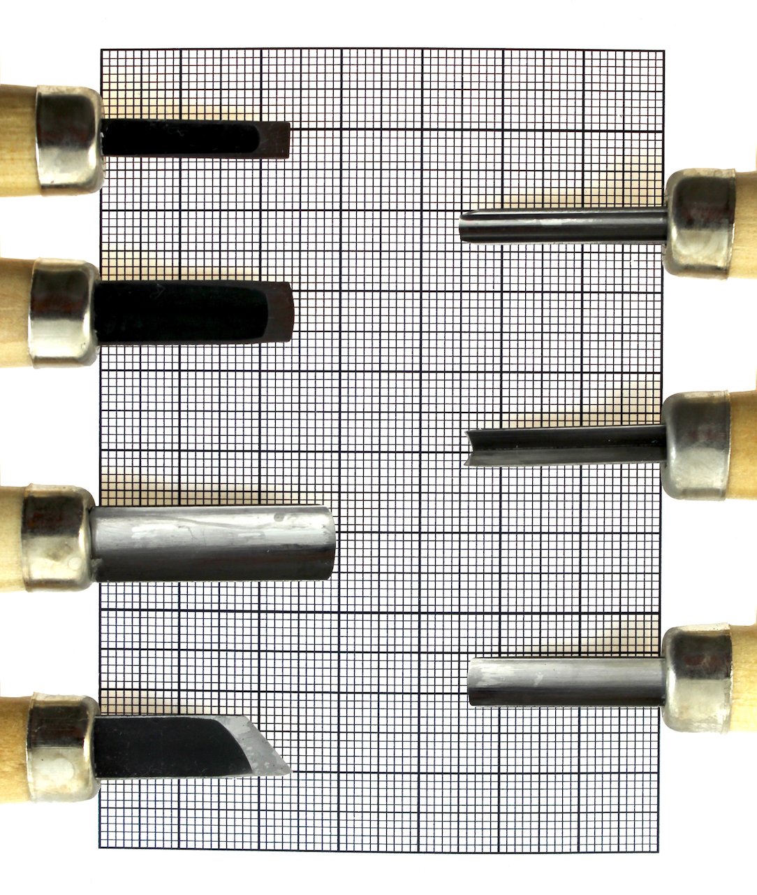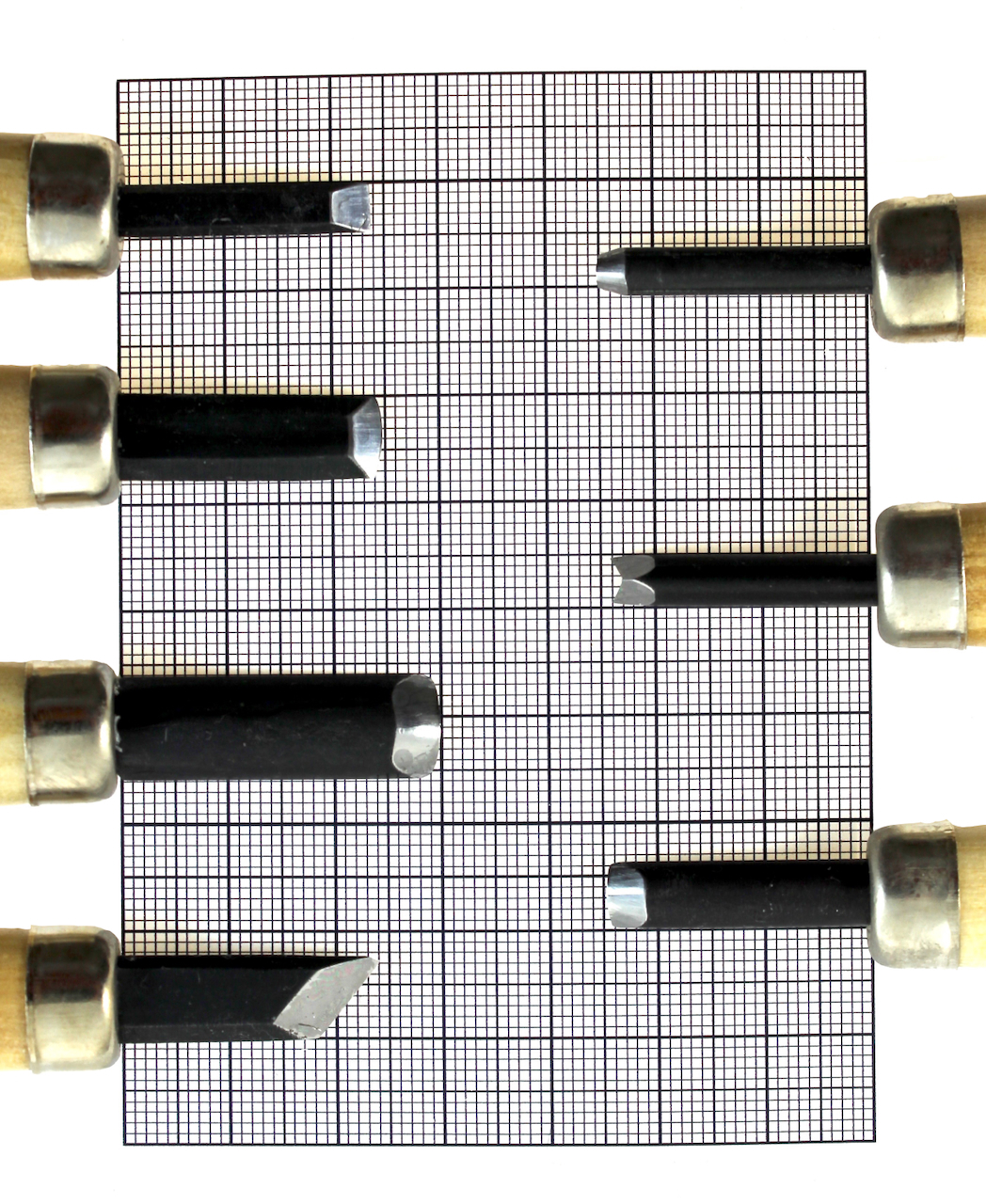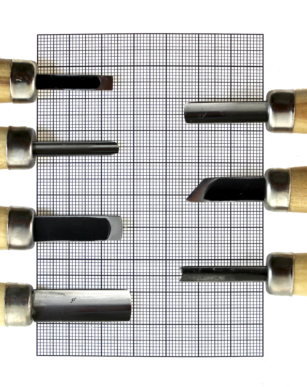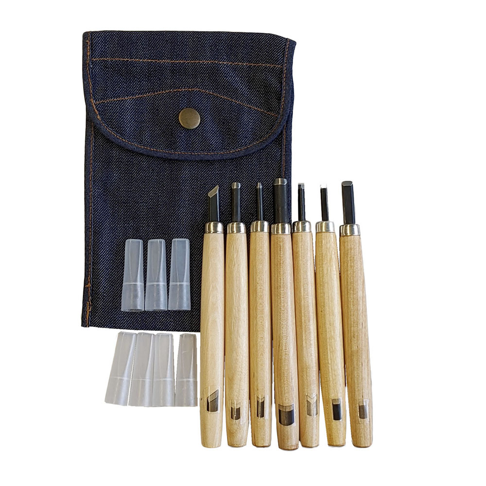Professional quality 7 piece right handed wood carving chisel set made from Yasuki two layer steel. Designed for school and beginner carving, this complete set includes essential profiles for woodblock and relief carving with denim case and safety caps included.