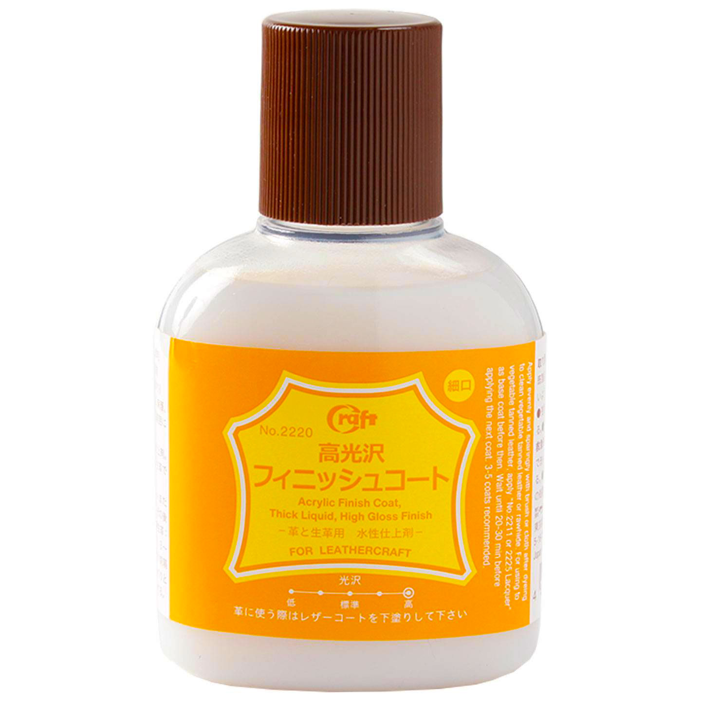 This quality water-based finishing agent from Craft Sha is an excellent product to ensure your leather creations will have a glossy, protective coating that will last for many years. This thick liquid, acrylic finish coat has the highest luster among the Craft Sha leather coat series.