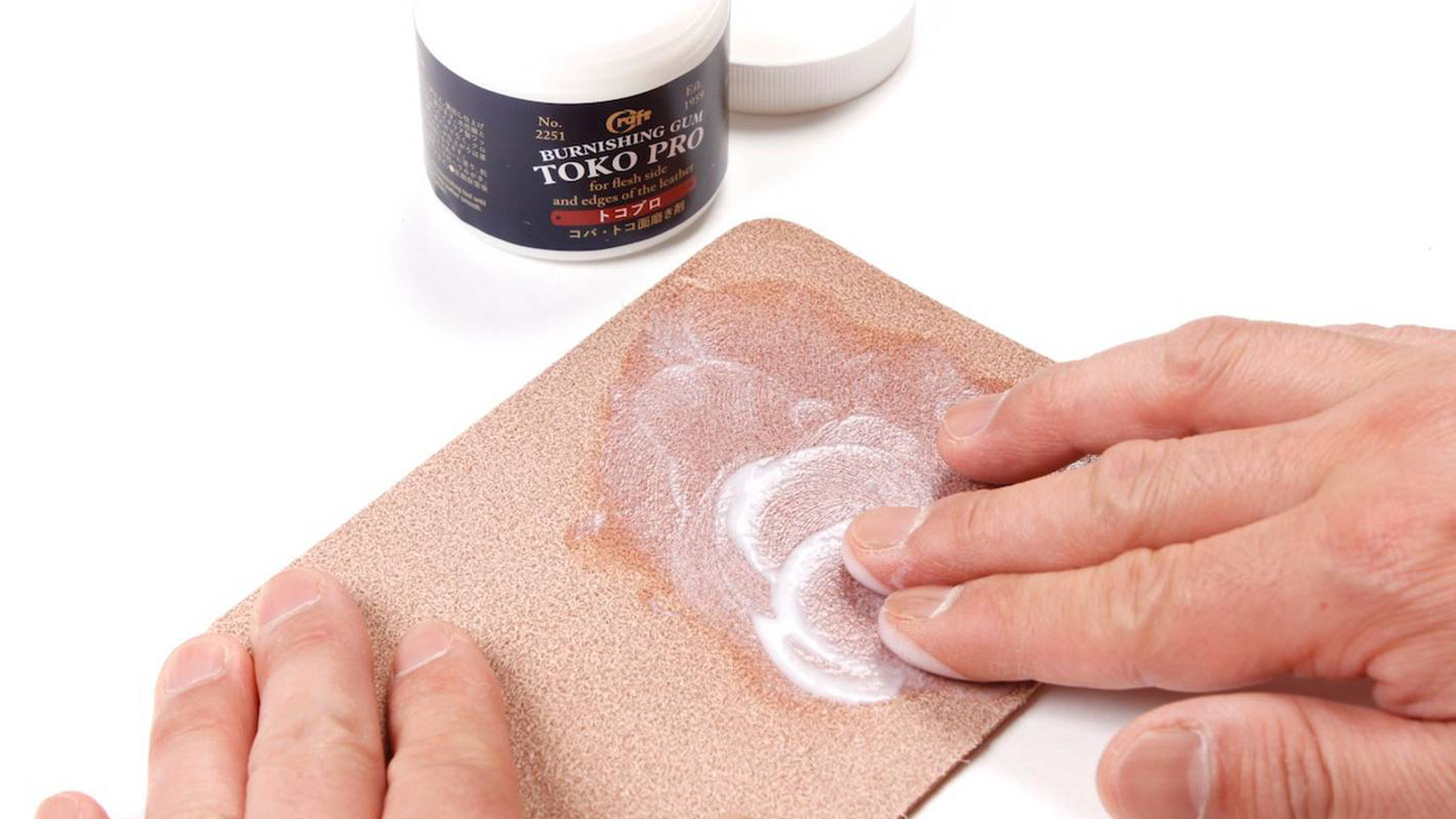 To use this Craft Sha Leathercraft Toko Pro Burnishing Gum for Leather Edge Finish 100g, simply apply to your leather's unfinished edge or flesh side evenly, then firmly work into your leather with the use of a burnishing tool until you achieve the desired finish. Reapply as needed. Please note, over-application may stain or distort your leather. We recommend the use of a canvas slicker or glass slicker, leather edge slicker or creaser, or edge slicker.