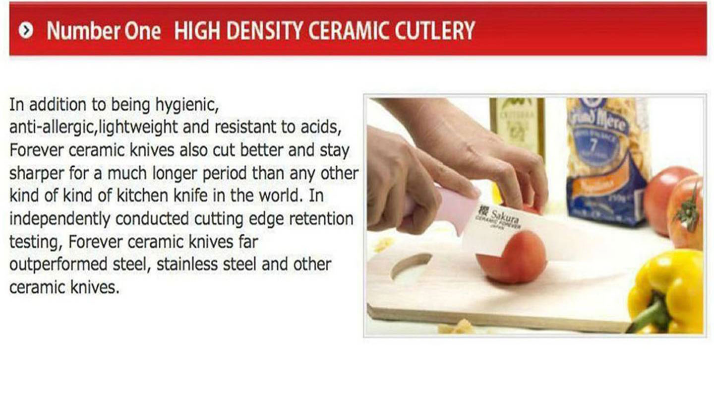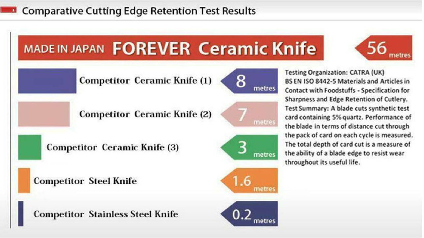 A. Not all ceramic knives are the same. There are many differences in raw materials and manufacturing methods and that leads to finished products of greatly differing quality, as can be seen in cutting edge retention test results. Cera Forever’s high density ceramic knives are 100% manufactured in Japan using Japanese raw materials and Forever's unique manufacturing method.