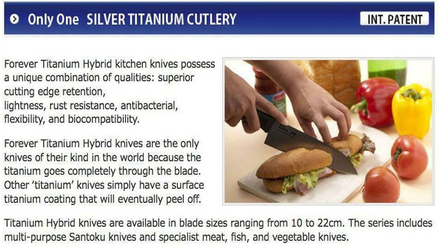 Cera Forever Titanium knives are the only knives of their kind in the world because the titanium goes completely through the blade. Other ‘titanium’ knives simply have a surface titanium coating that will eventually peel off.