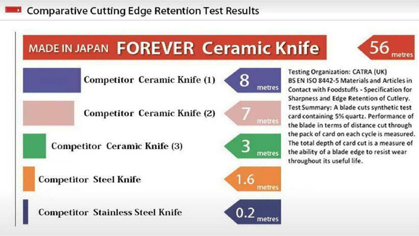 A. Not all ceramic knives are the same. There are many differences in raw materials and manufacturing methods and that leads to finished products of greatly differing quality, as can be seen in cutting edge retention test results. Cera Forever’s high density ceramic knives are 100% manufactured in Japan using Japanese raw materials and Forever's unique manufacturing method.