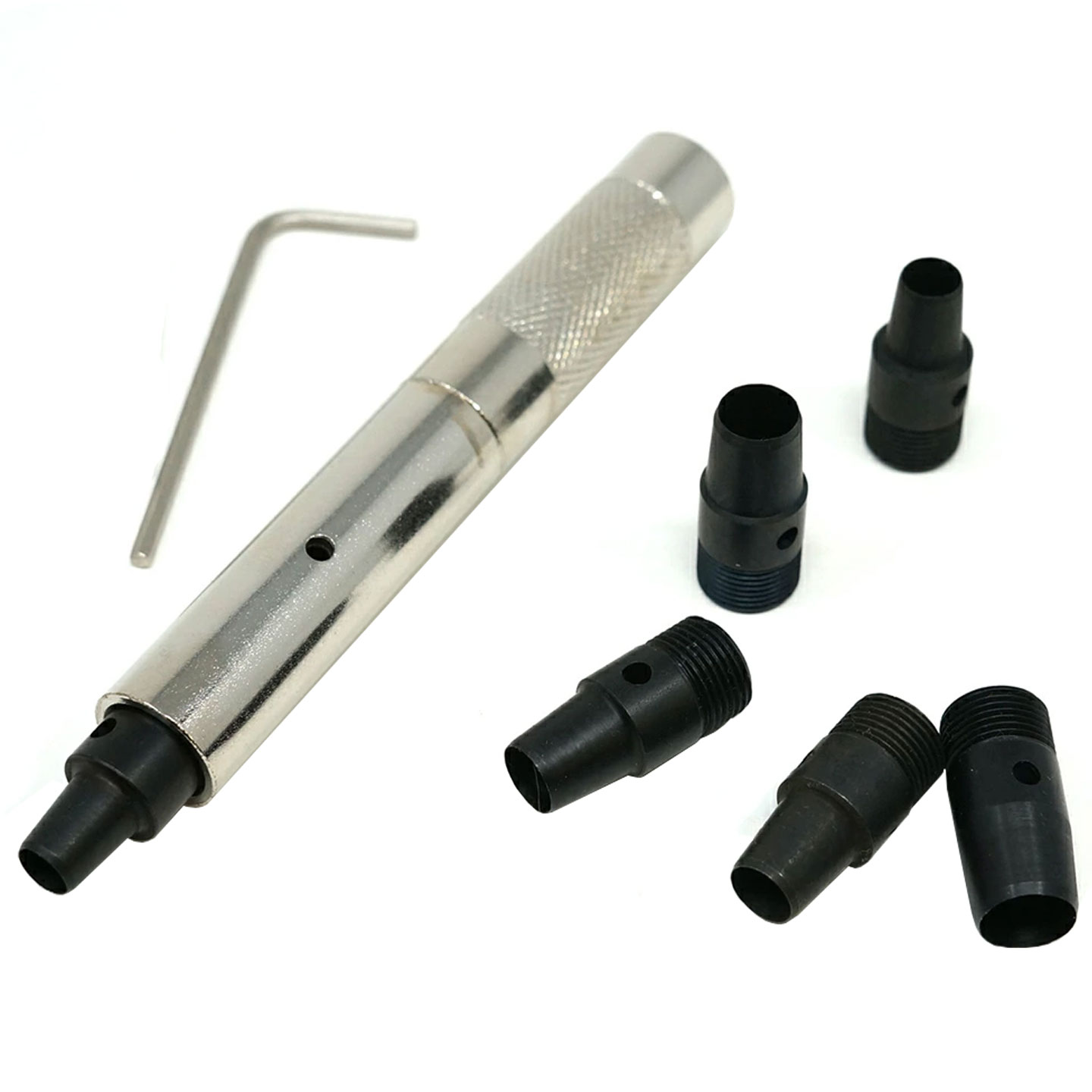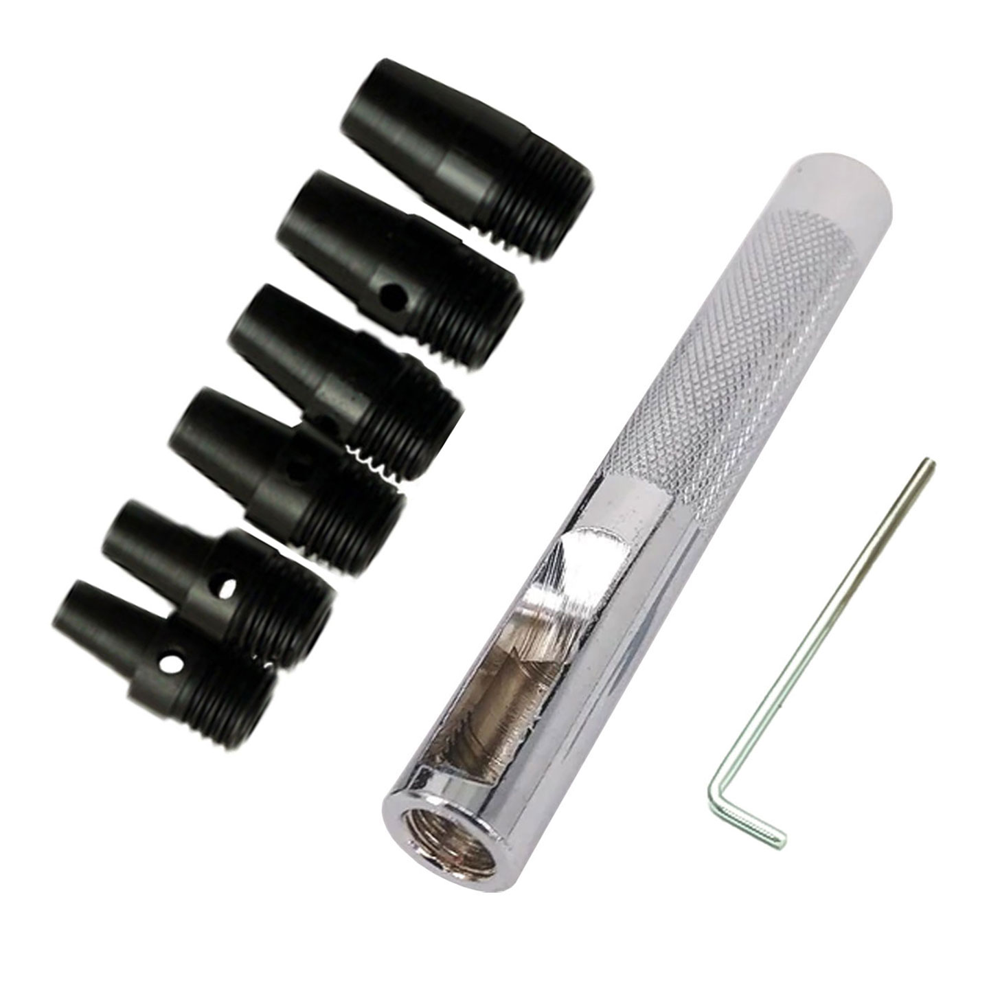 This Ivan's multi-size round hole punch set includes six sharp-edged punches for punching holes in your leathercraft items. This tool has a knurled texture that provides comfort and a better grip while in use, and it punches accurate round holes with every mallet strike. This kit includes a wrench for tightening and loosening the punches and interchanging them as needed.