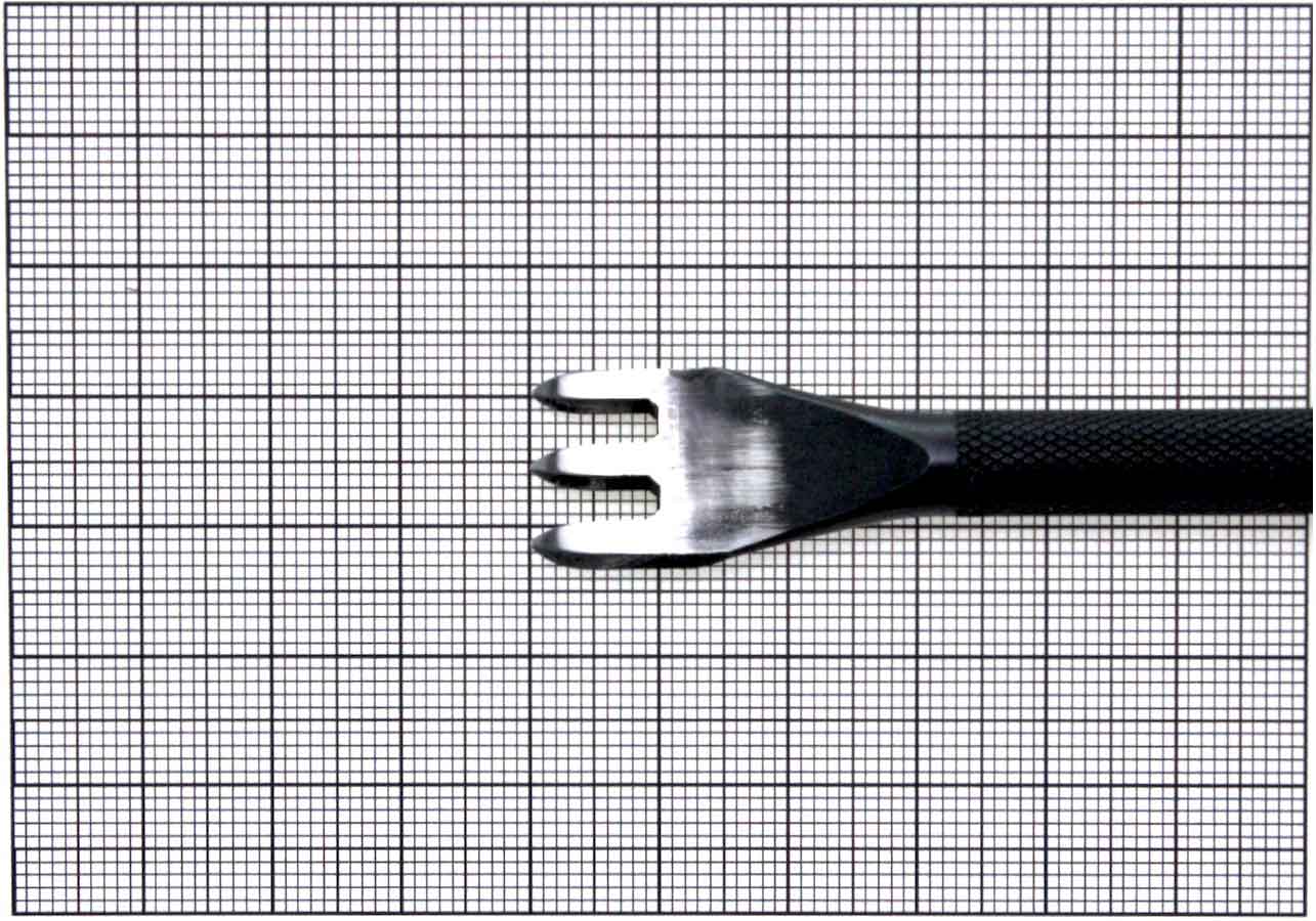 Kyoshin Elle's three prong, 6mm diamond point pricking iron is made in Japan, and is excellent for making short, straight stitch lines in your leathercraft project. This tool is highly tempered, which results in excellent toughness of the prongs, great for leatherworking. Punch stitch holes through your work using this tool so that you may sew consistent, regularly spaced, and symmetrically slanted stitches. This tool has an anti-slip handle that provide a secure grip and provides comfort when using, which is very useful if you spend a lot of time creating stitch holes for your leather projects. This leathercraft tool forged from high-quality materials and is produced to the highest standards in Japan.