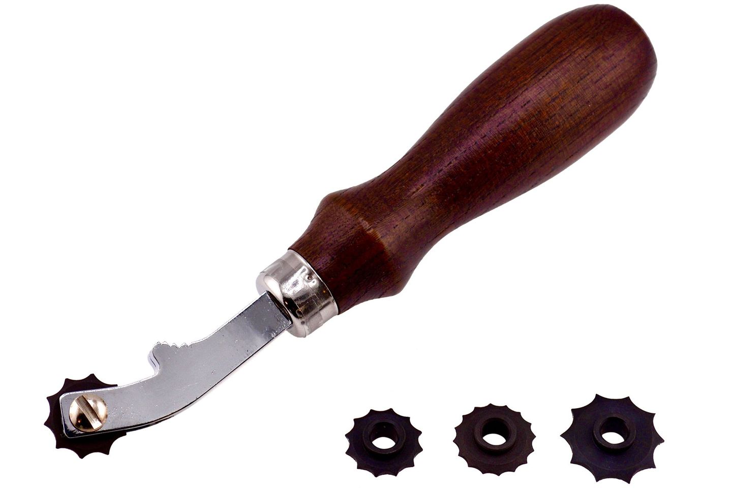 Comes with a total of four stitching wheels where the points are 3mm (0.12, or 8 holes per inch), 4mm (0.16, or 6 holes per inch), 5mm (0.20, or 5 holes per inch) and 6mm (0.24, or 4 holes per inch) apart. Unlike most other kits, this one comes four stitching wheels, not three.
