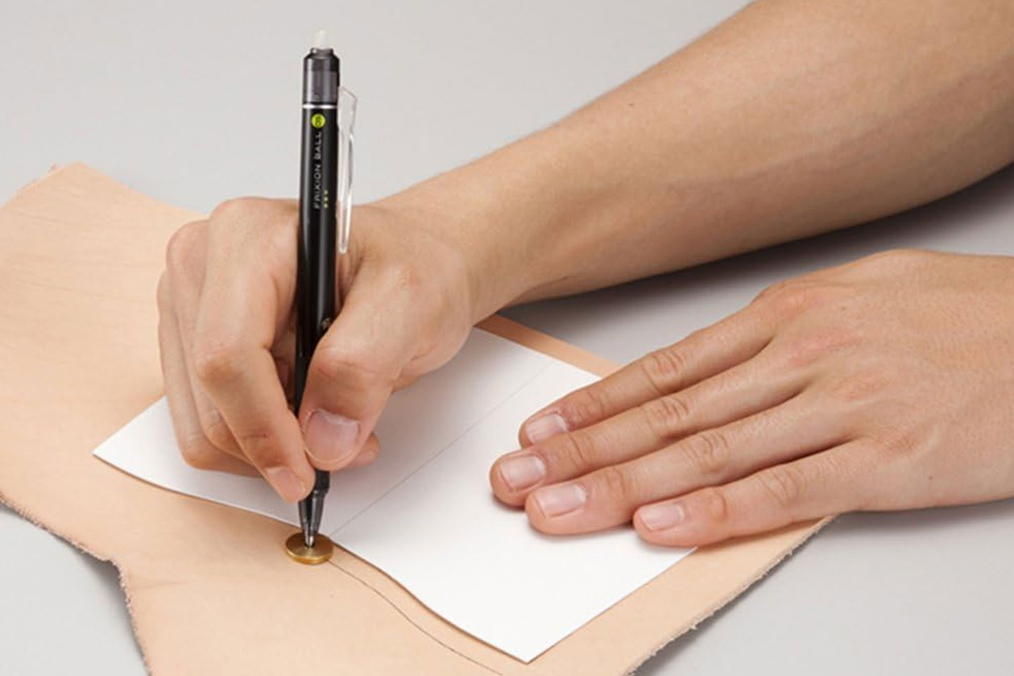 Place the leather template or pattern on the work surface. Insert a pen, awl, or marking tool into the centre hole of the seam allowance disc. Slide the outer edge of the disc along the template edge while allowing the marking tool to trace a parallel line along the leather surface.