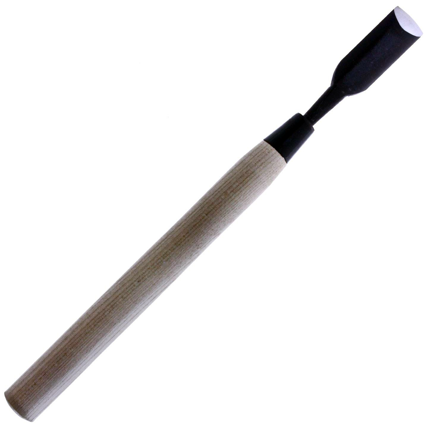 This Michihamono's tsuki nomi tool features a very shallow gouge that is great for three-dimensional modelling. This tool's 18mm wide cutting edge makes it excellent for removing big chunks of wood. The shallow gouge smooths wood surfaces without damaging the grain or going too deep into the wood. It features a shallow angled bevel for sharp cuts and is more durable than finer wood carving tools. The blade and handle size of this Tsuki Nomi lie in between small Japanese hand carving tools and full-sized socket wood carving tools, giving it the best of both worlds for intermediate wood carving tasks.