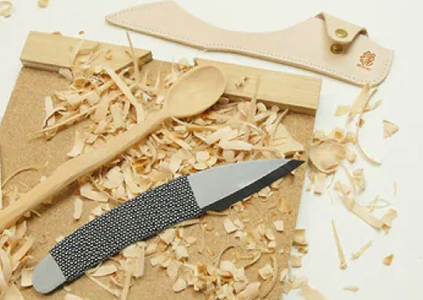 This wood carving knife has a curved design with a straight cutting edge, improving its cutting capabilities and easier to apply pressure than conventional whittling knives. This tool also comes with a leather sheath, making it easy to carry and store safely when not in use.