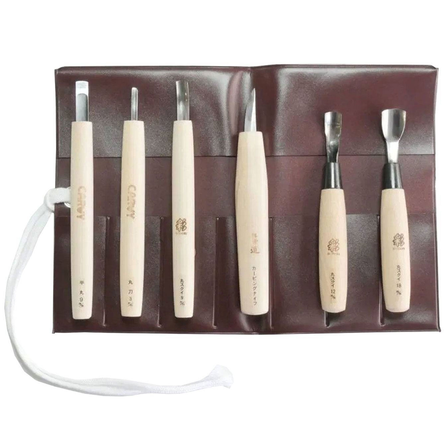 Michihamono 6 Piece Wooden Cutlery Woodcarving Tools Set Woodworking Knife, Gouges, Chisels Kit, with Case, for Carving Spoons & Bowls