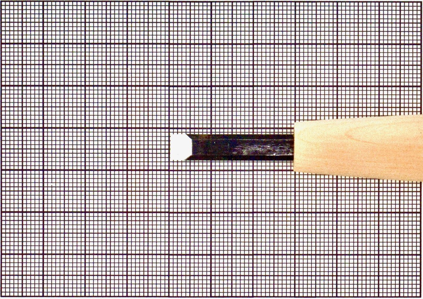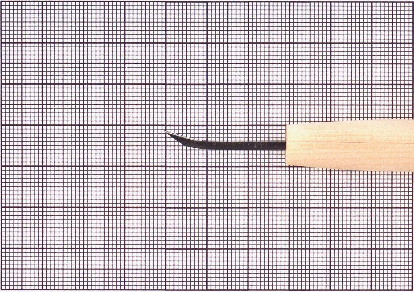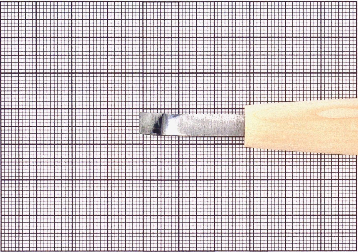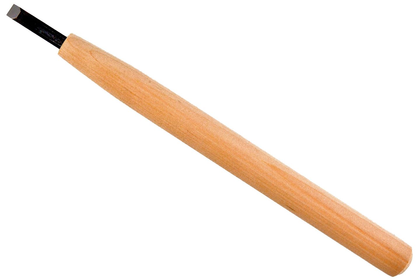 This wood carving tool, which is good for undercutting and cleaning wood grain where straight tools won't be able to get in, features a 6mm flat cutting edge and a short bent blade.