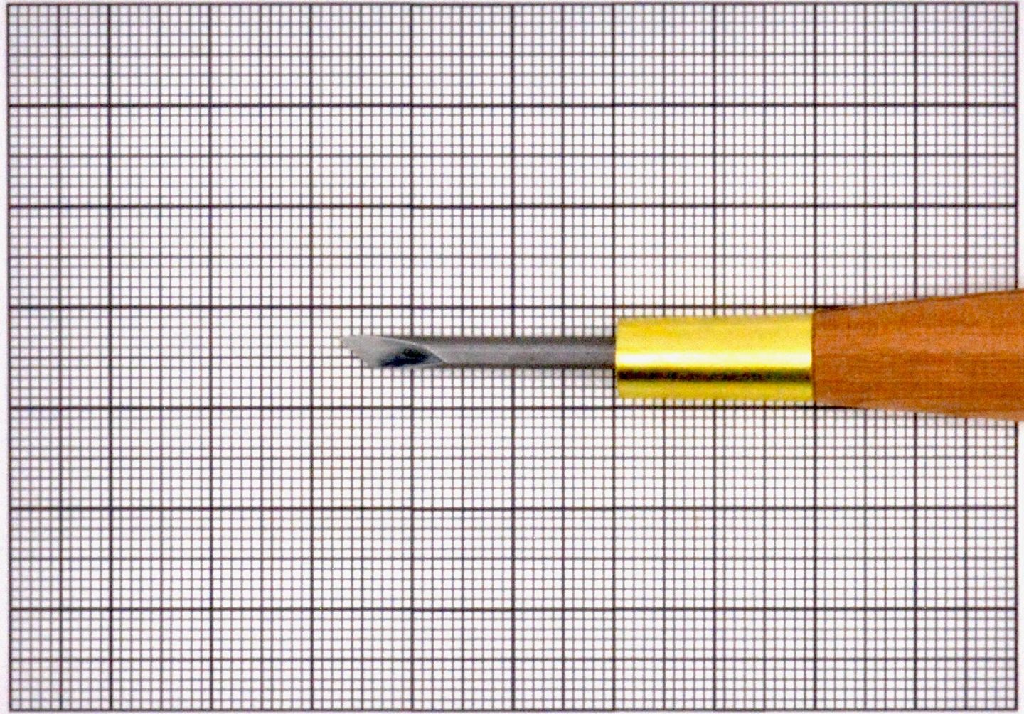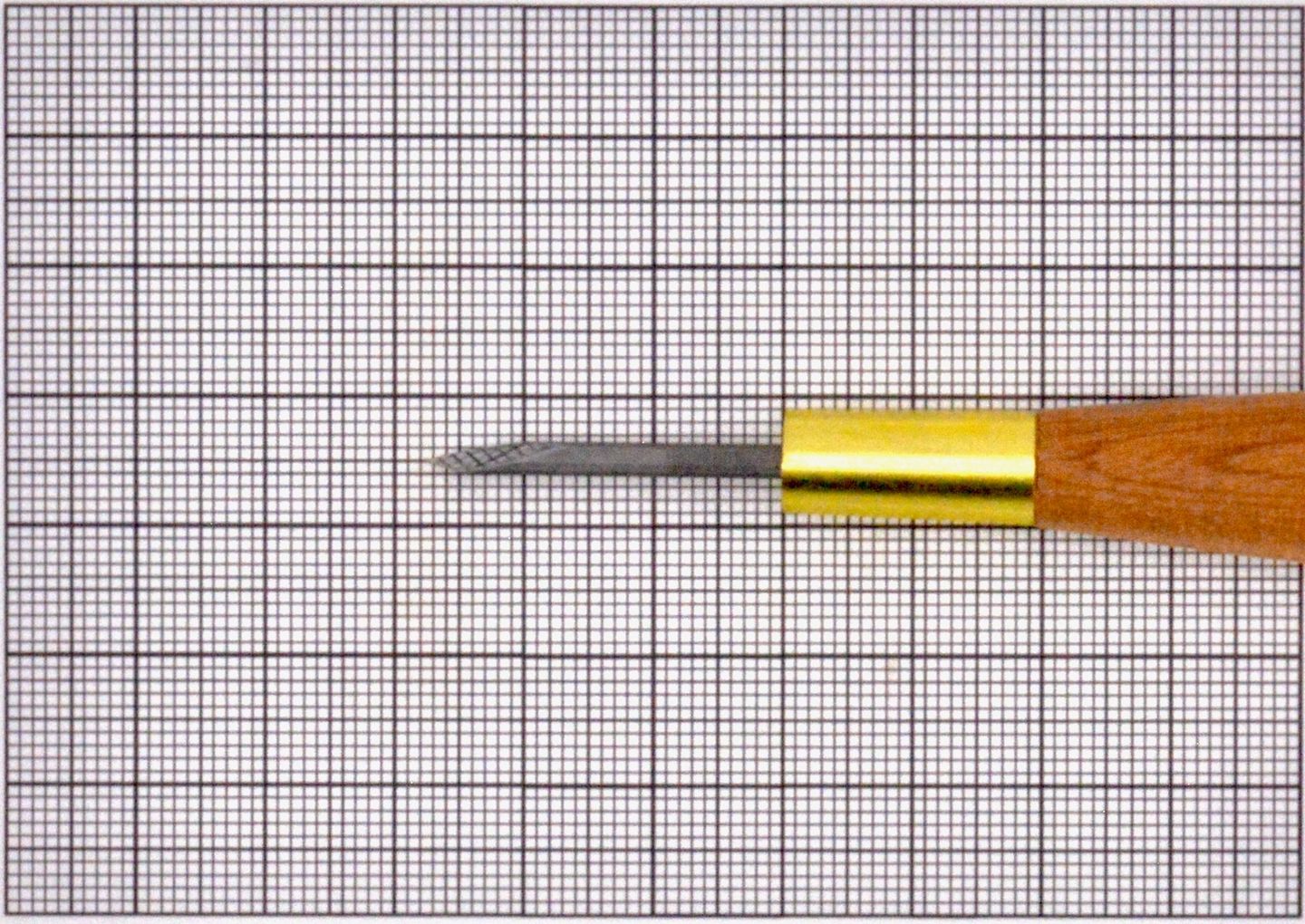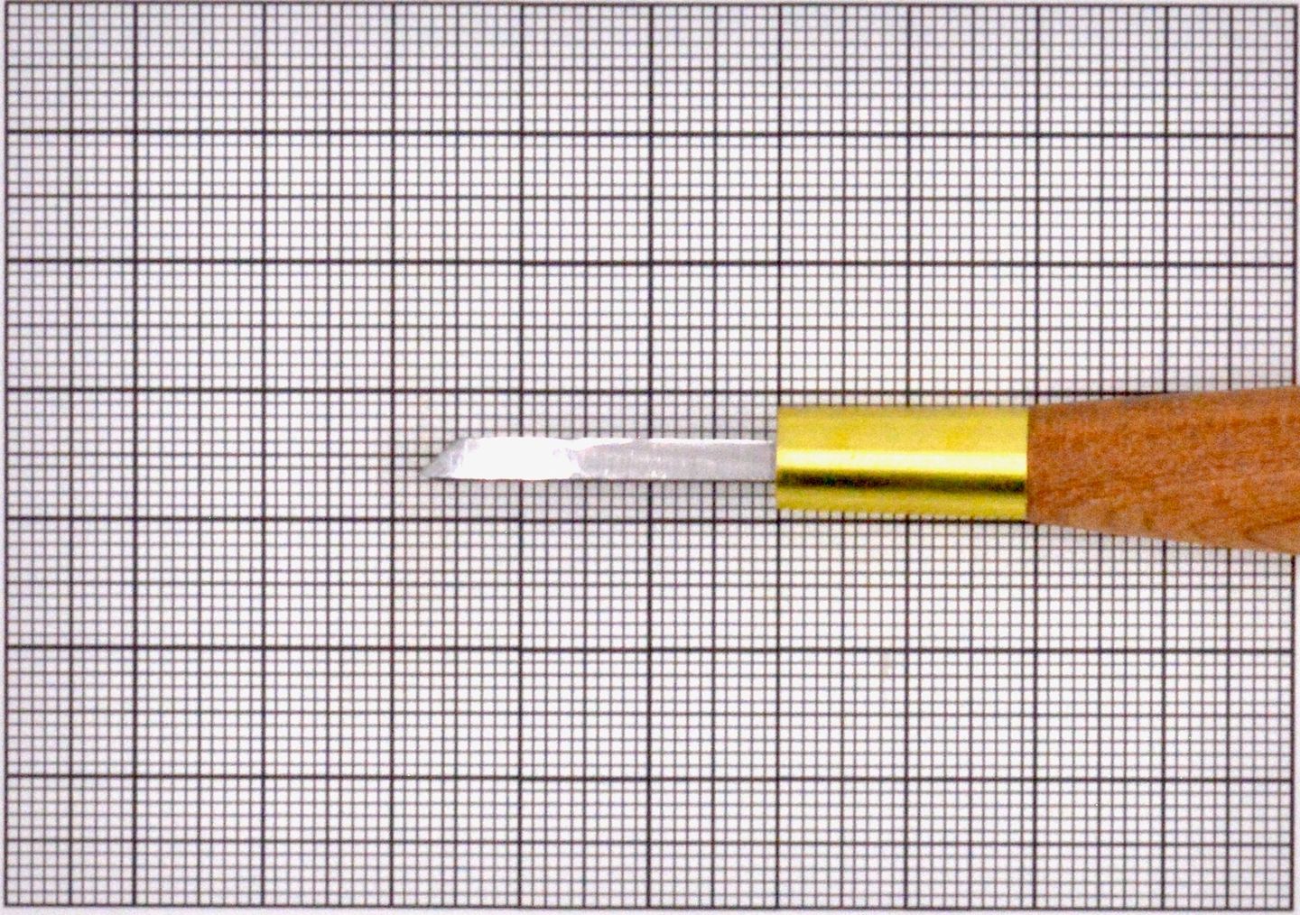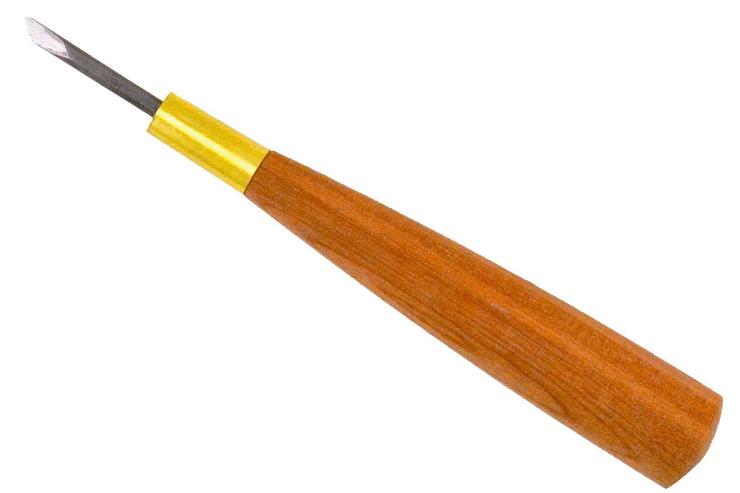 To use, simply hold the handle firmly in the palm with your thumb, forefinger, and middle finger grasping the ferrule. Tilt the blade slightly and apply light pressure to achieve smooth, exact cuts, ideal for detailed corners in woodblock prints or intricate carvings.