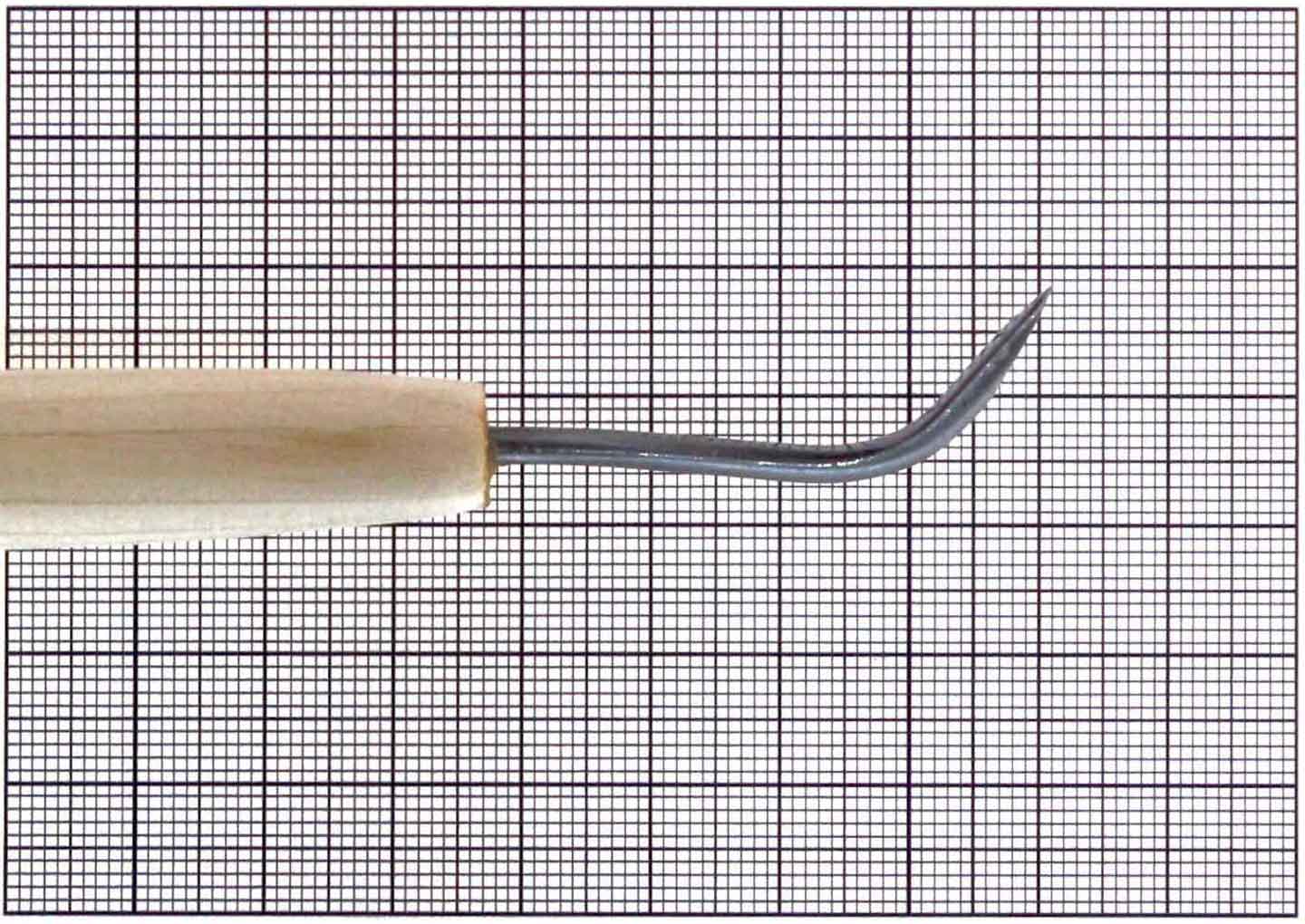 A special skew chisel with a bent blade for reaching tight areas of wood that is not accessible by a straight chisel. It has a 4.5mm wide cutting edge that cuts through wood grain smoothly.