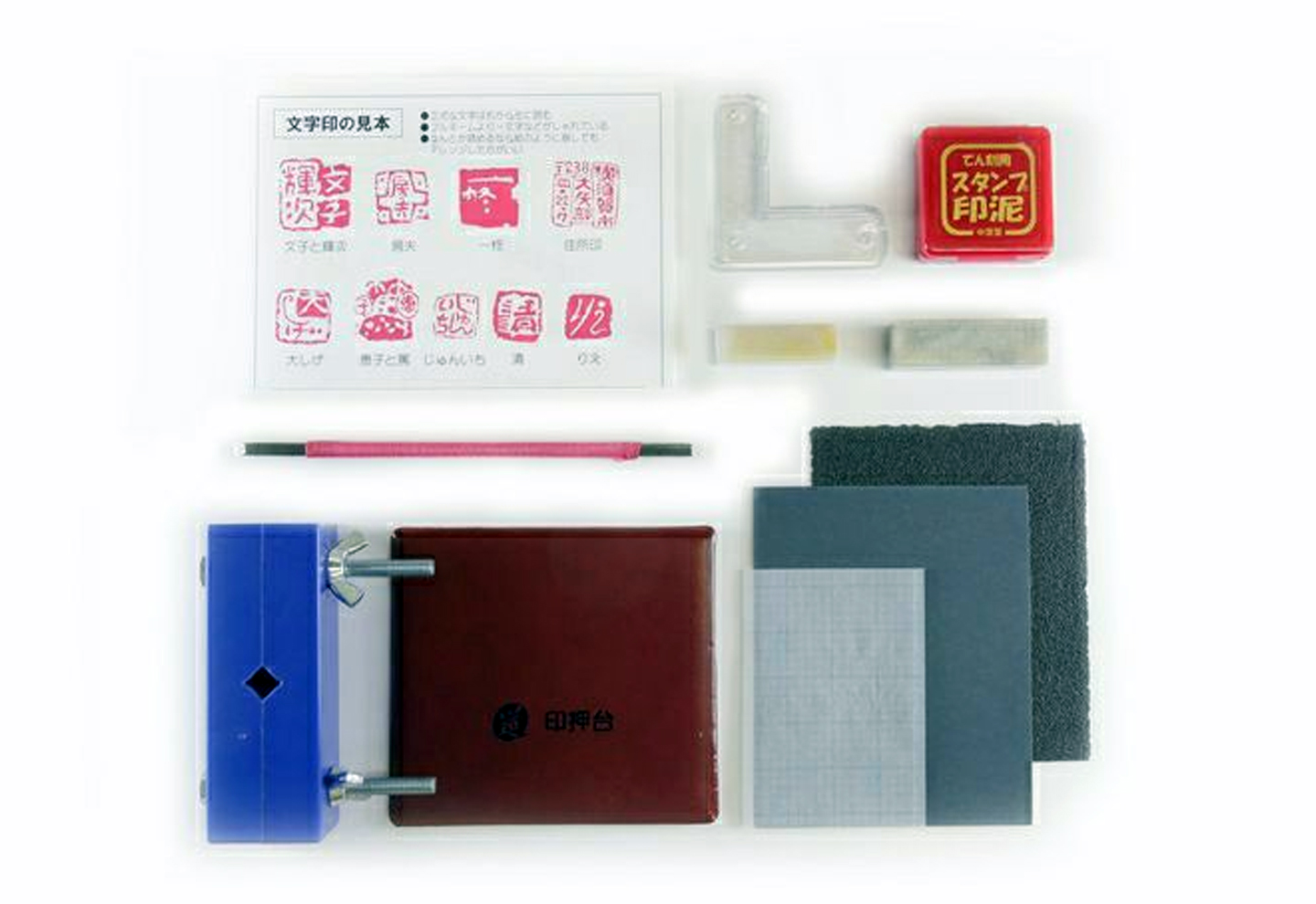 Learn traditional Japanese tenkoku seal engraving with a complete beginner stone carving kit including 4mm chisel, stones, vice, ink pad and alignment tools.