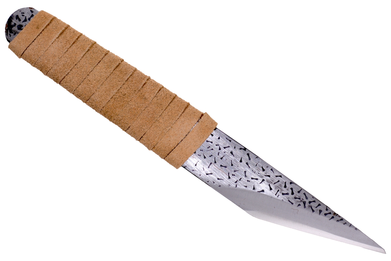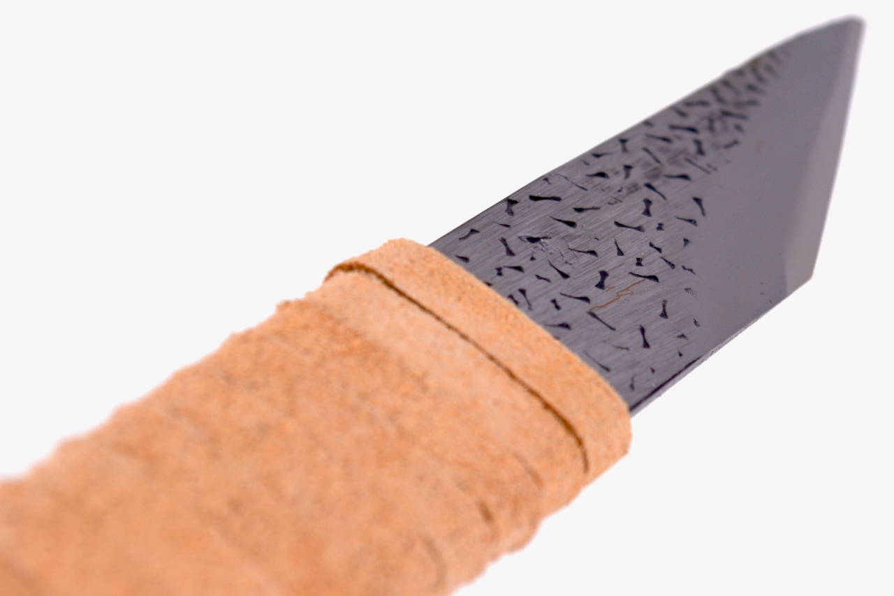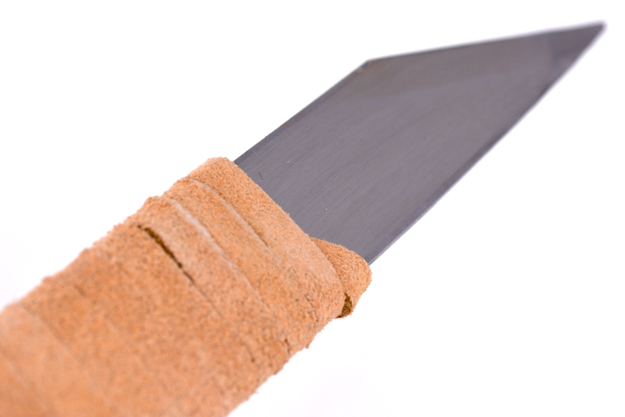 Carve wood with this handy wood carving knife from Michihamono, a renowned Japanese manufacturer of carving tools. This tool is forged from high-quality steel from the blade tip to the handle and comes sharp and ready to use right out of the package. This tool's handle is wrapped in leather, making it easy to grip and providing better control and comfort when using.