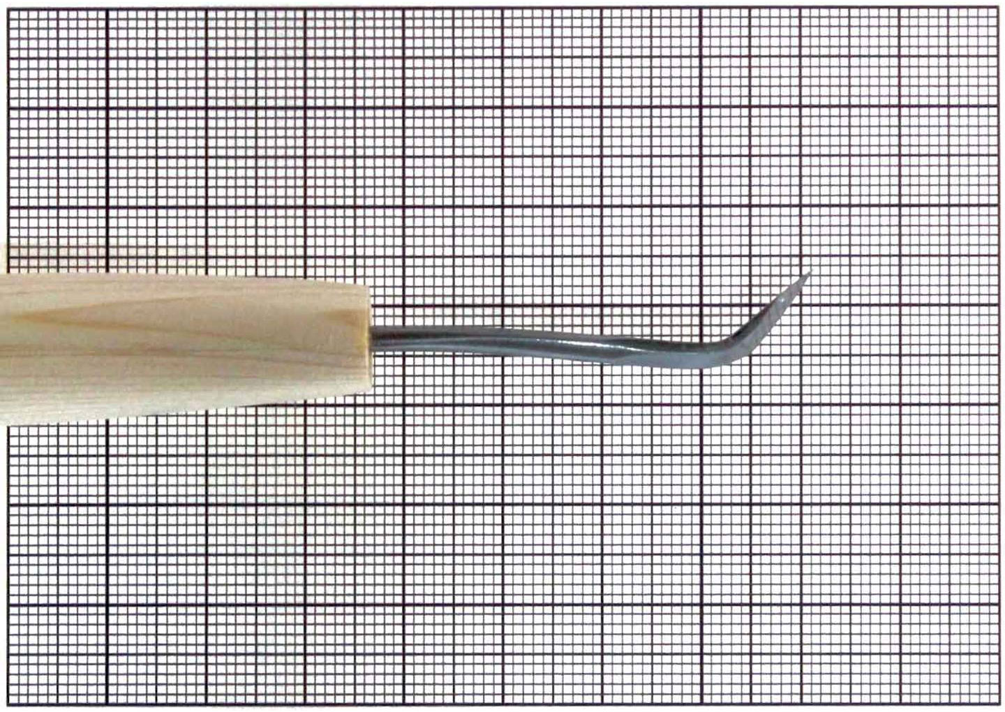 This woodcarving tool can get into corners and recesses of a woodblock relief and wood sculptures where straight and square-edged tools cannot access. Because of its unique bent shape, it allows the cutting edge to finish deep areas such as the neck part of Buddha sculptures and other similar parts without the tool bumping into protruding parts of the wood.
