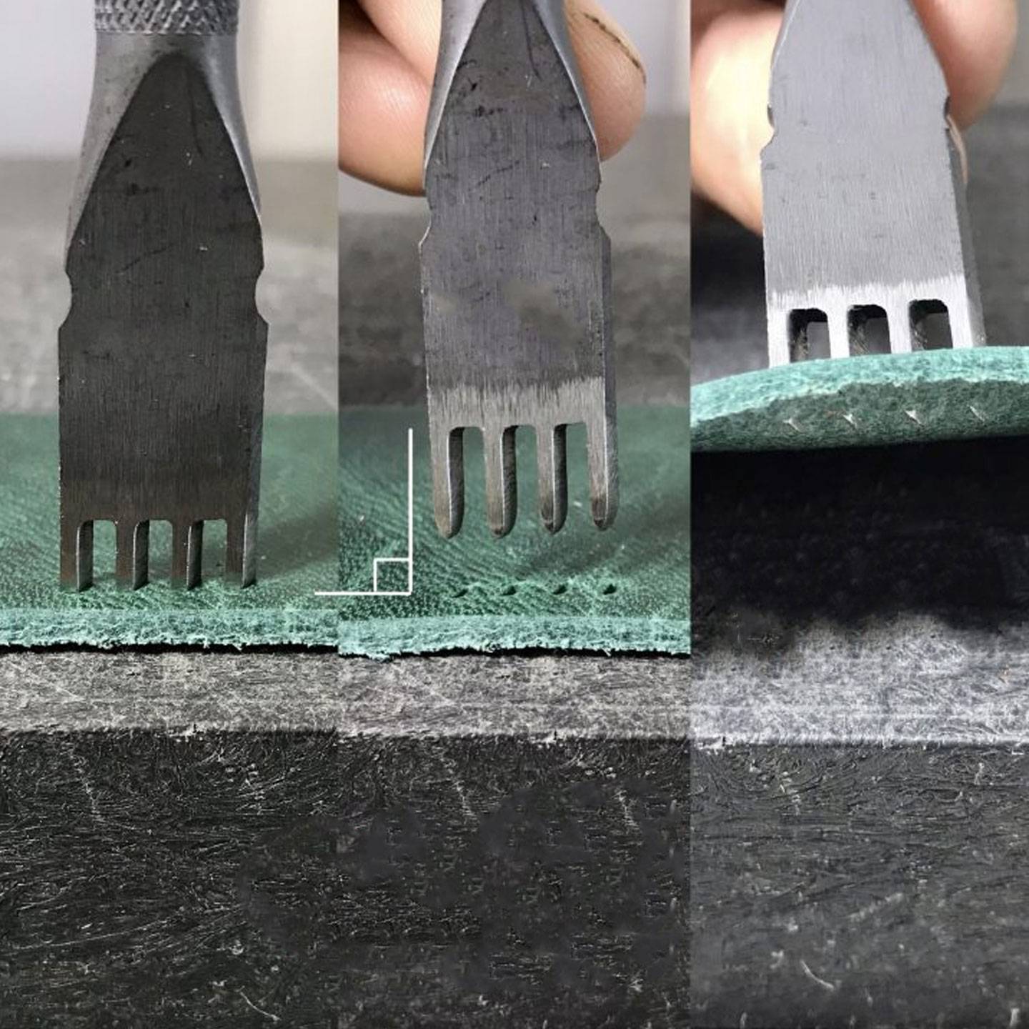 When punching holes or removing this tool from your leather, keep it perpendicular to your leather and use a soft-headed hammer instead of a metal hammer to avoid damaging the tool. The heavily tempered prongs of this tool have a dual purpose: not only are they extremely strong and ideal for penetration, but they also protect your leatherwork from uneven stitching by breaking, rather than bending, when overstressed. This prevents the tool from creating uneven stitch holes, which can occur with cheaper stitching chisels due to an undetected bent prong.