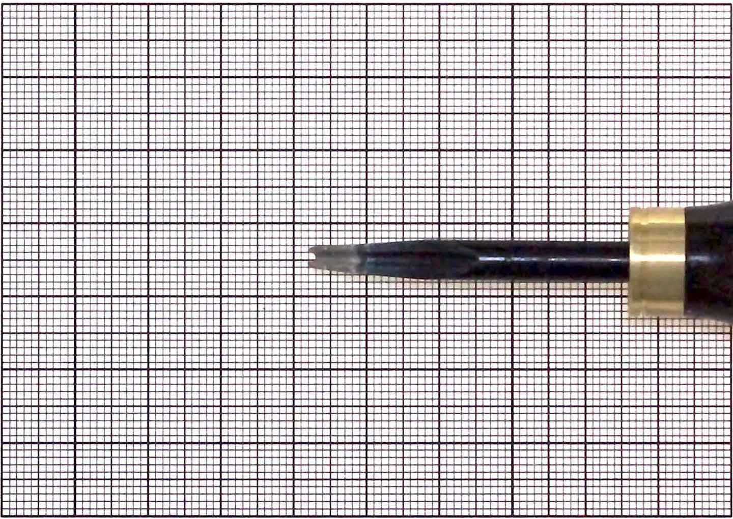 To sharpen this beveller use a thin metal rod, or similar implement, that can be placed under #1000 grit sandpaper to act as a ridge that will ensure the sandpaper will fully contact the underside of the cutting edge of the blade when the beveller blade is placed on top. Using your implement and sandpaper, dampen the sandpaper with mineral oil and draw the blade across the sandpaper in a pulling motion (do not push), repeat until the desired sharpness is attained. To ensure a long lasting sharpness, strop the sharpened blade with the flesh side of a piece of leather using jewellers rouge.