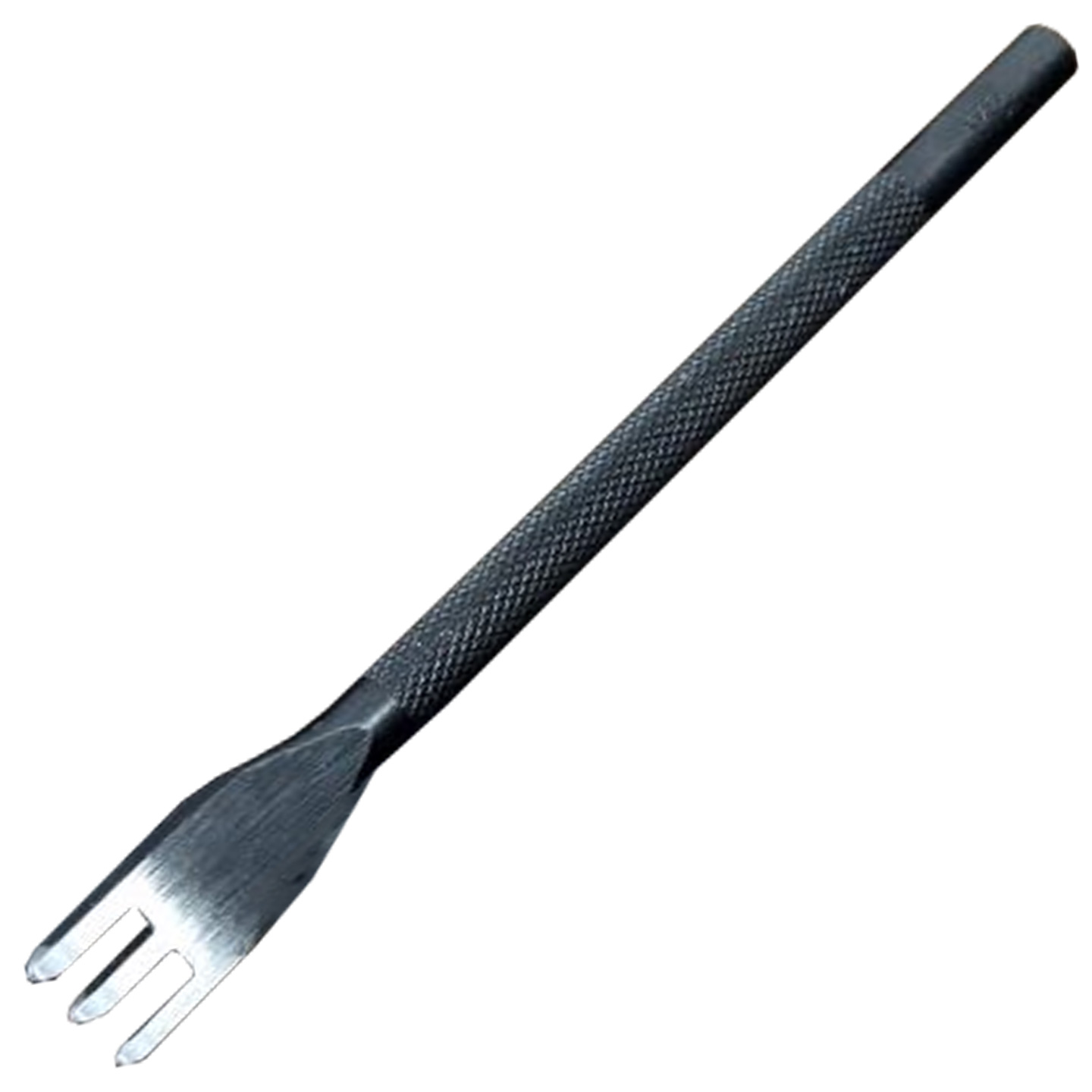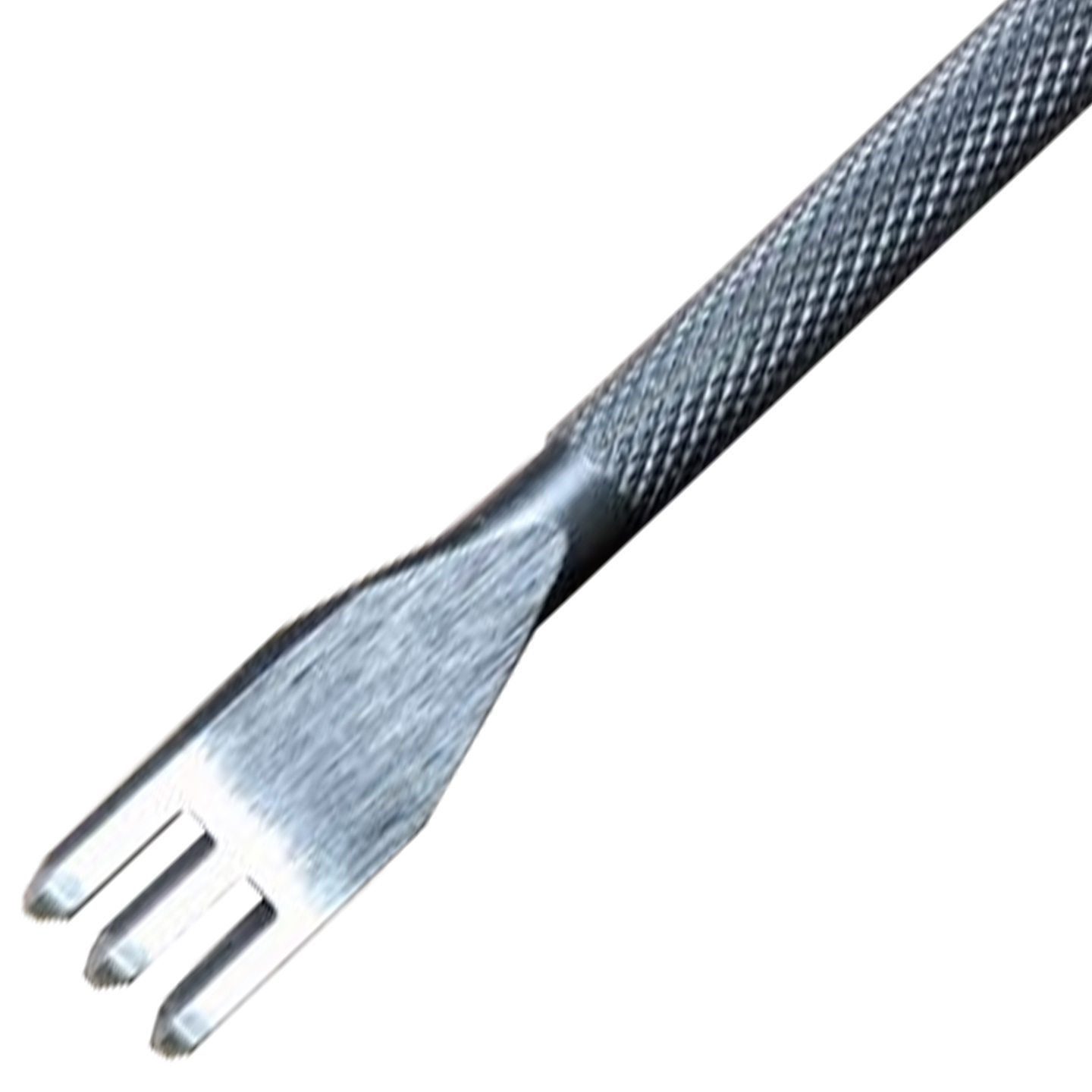 This 3-prong reversed leather stitch punch is great for punching diamond-shaped stitch holes on short, straight edges in your leather, but with the holes slanting in the opposite direction to the holes made by regular pricking irons. This stitch punch, unlike other pricking irons, is intended to pierce leather, removing the need for an awl and reducing the time to punch stitching holes.