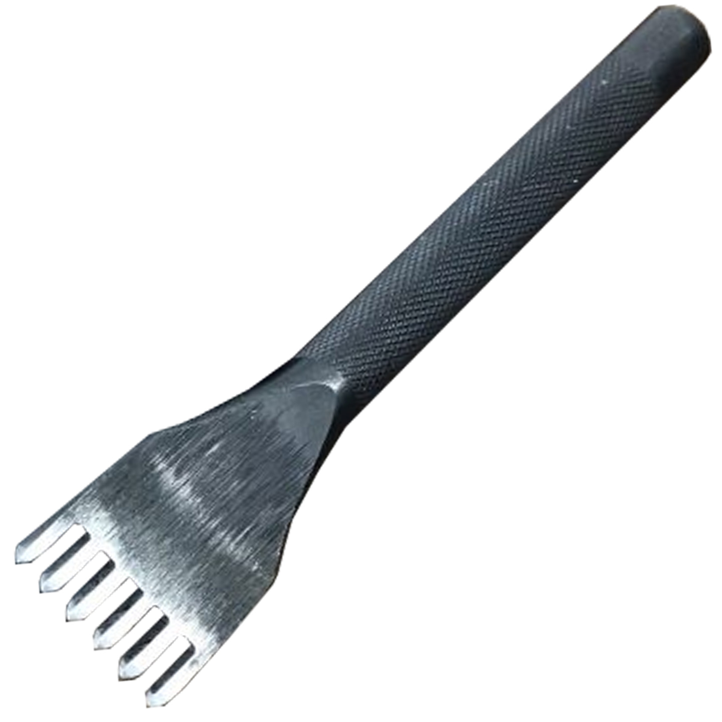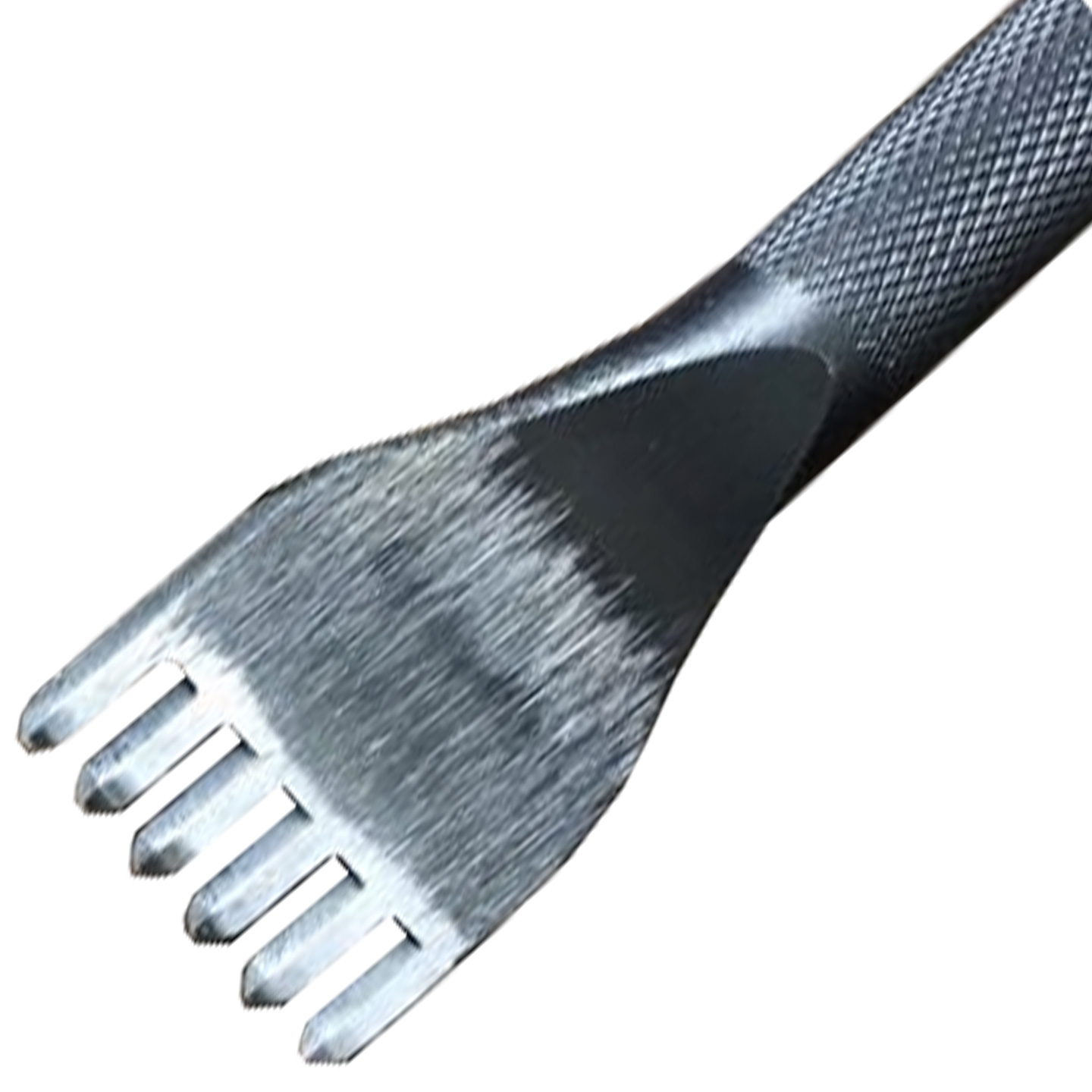 When punching leather in a long straight line, use this 6-prong stitch punch to create six perfectly spaced diamond-shaped holes at once. Stitching holes created with this leathercraft stitch punch are neat and consistent, easy to sew, and practical, making them perfect for both novice and experienced leather craftsmen. As a reverse pricking iron, the holes made by this tool will appear in the opposite direction when compared to those made by a regular pricking iron.