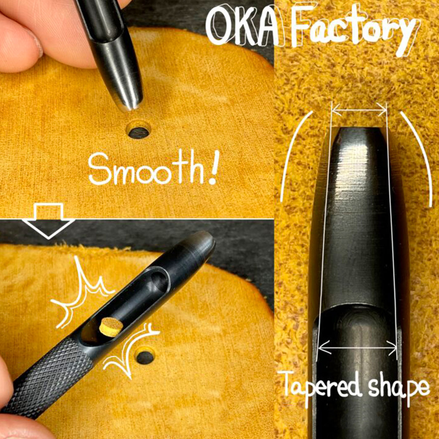 This Oka round hole drive punch can punch accurate round holes in your leather projects. This tool will give years of service and is a perfect addition to your leather tools collection. The whole tool is made of high-quality steel that has been hardened for increased toughness. This round punch cuts smooth, clean holes in leather watch straps and belts. You can also use this tool to make decorative perforations in your leather.
