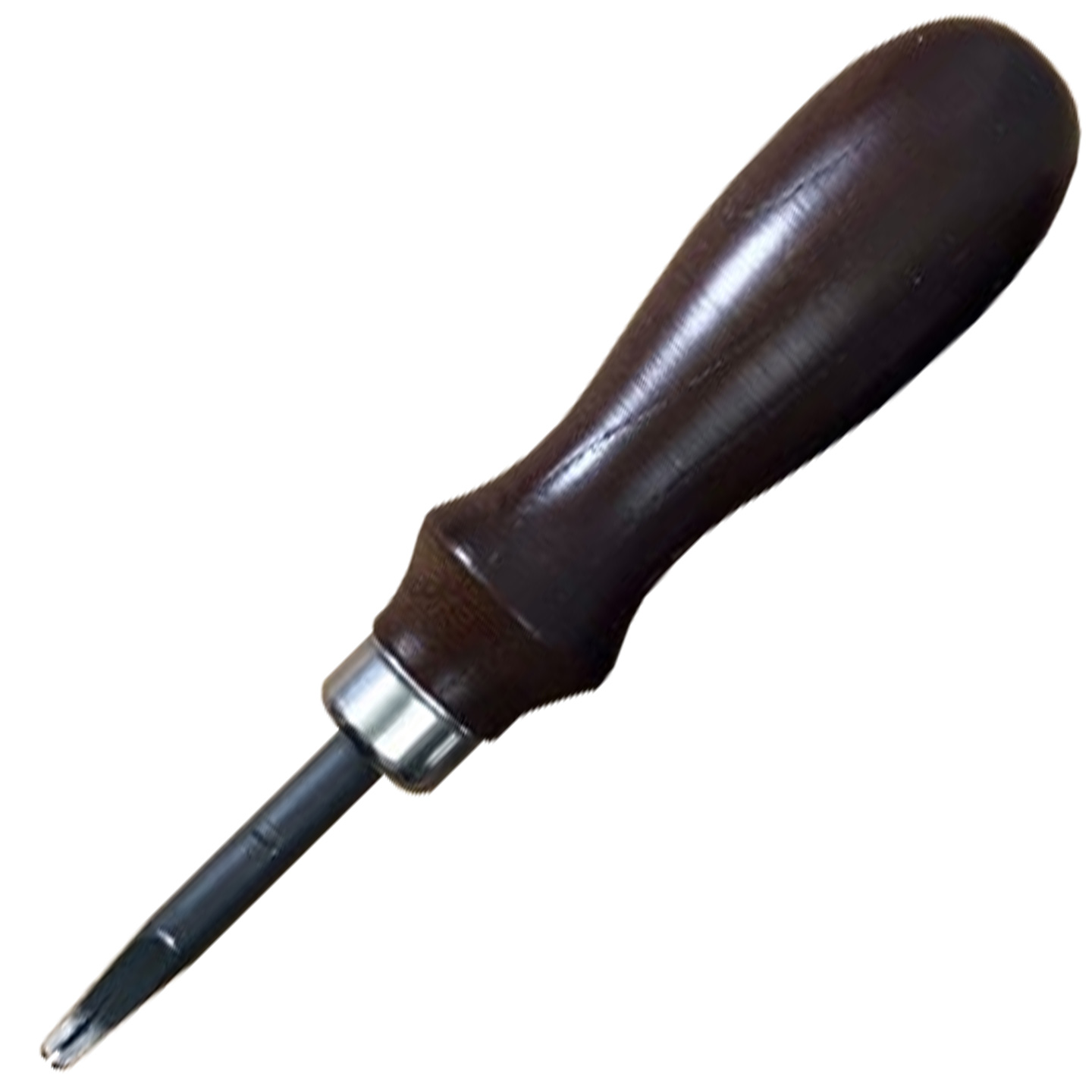 This Oka special leather edge beveler's sturdy wood handle is ergonomically designed to provide better grip and prevent the tool from sliding off your hand during beveling. The blade of this tool is tempered for improved strength and features a sharp blade that lets you effortlessly smooth and trim the edges of your leather goods, giving them a clean, professional appearance. A brass ferrule is attached to the handle by a tiny nail, which secures the blade and prevents the handle from breaking.