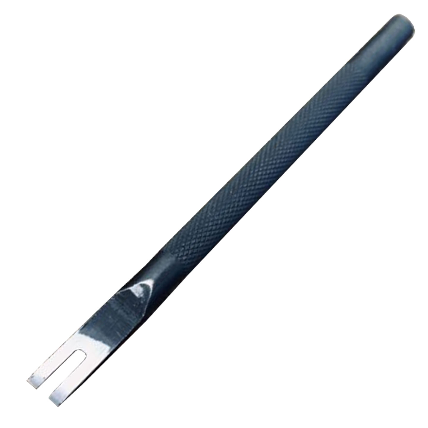 Punch flat, professional-looking lacing holes with this 2 prong thonging chisel from Oka of Japan. This tool has evenly sized prongs, great for punching precise and clean horizontal slits suitable for stitching or lacing leather. The handle of this tool underwent a knurling process, allowing for a better grip during use and the whole tool is tempered for increased toughness, making it great for leathercraft.