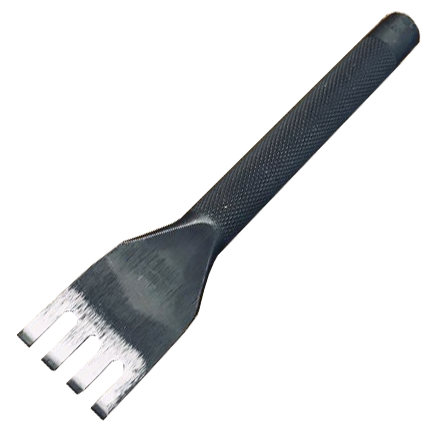 Punch four evenly spaced and sized slits on your leather at once with this 4 prong leather thonging chisel from Oka of Japan. Each prong is polished by hand individually to make sure it will cleanly cut leather and leave professional-looking lacing holes. The entire blade is tempered, improving its toughness and the knurled handle provides better grip and control during use.
