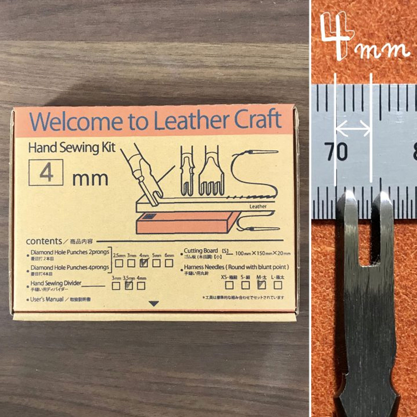 Welcome to Leather Craft is a hand sewing kit from Oka that includes the tools that will help you to create stitch guides, punch sewing holes, and stitch your leather.