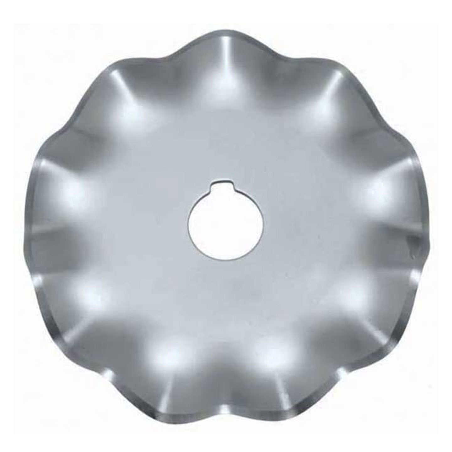 Circular rotary replacement decorative wave blade designed to produce a wave-like pattern on the edge of the material being cut. This blade is made of stainless steel for sharpness and durability.