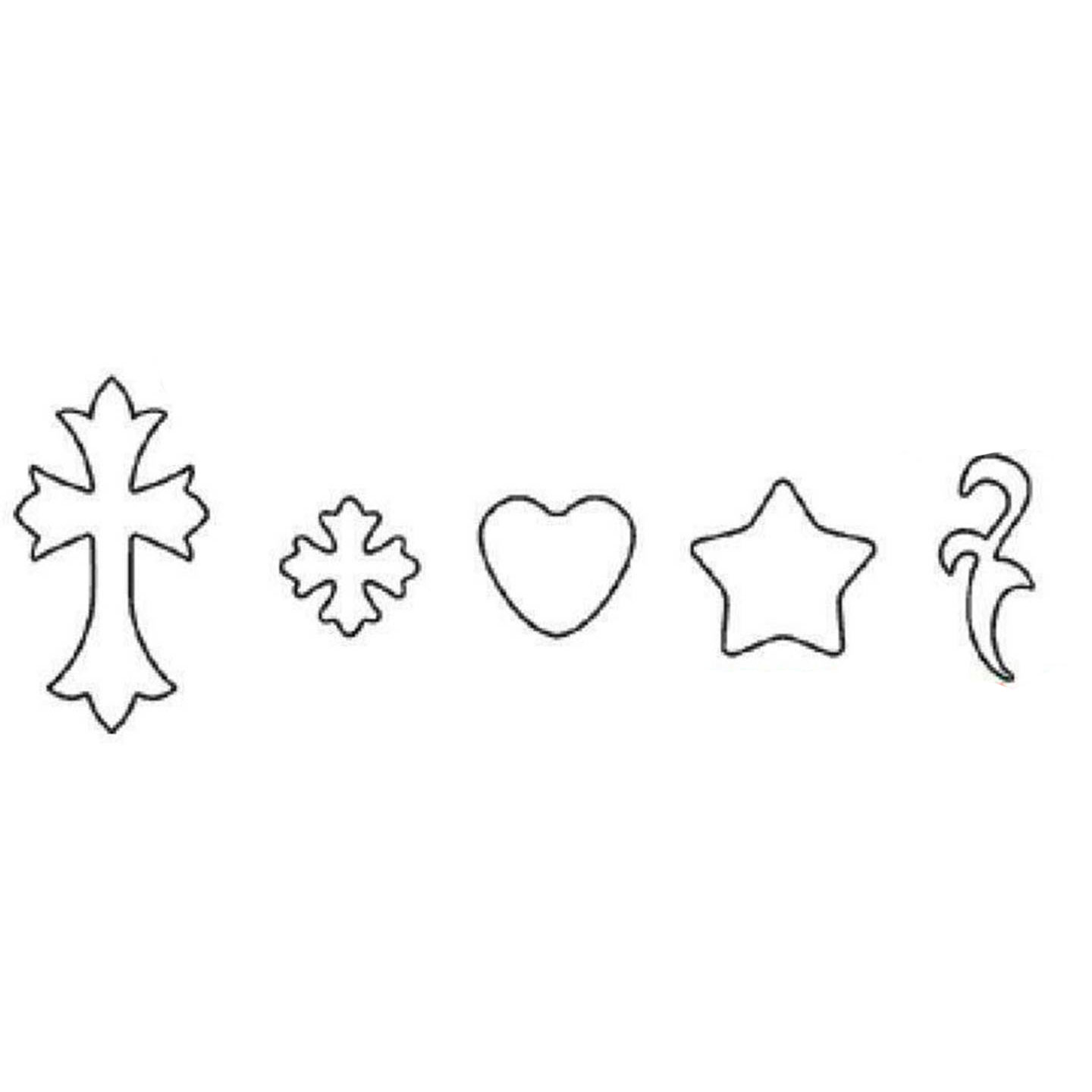 You're looking at a set of five moulds for PMC art clay. The crucifix measures 15mm in width and 29mm in length, while the 'f' shape measures 8mm in width and 16mm in length. The heart shape measures 10mm by 11mm, the star shape is 13mm all round, and the small cross is also 13mm all round.