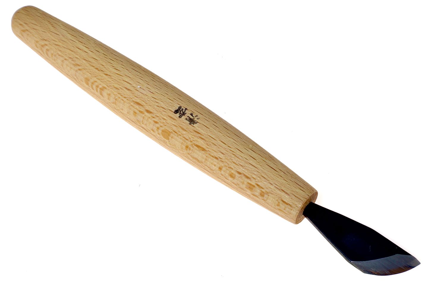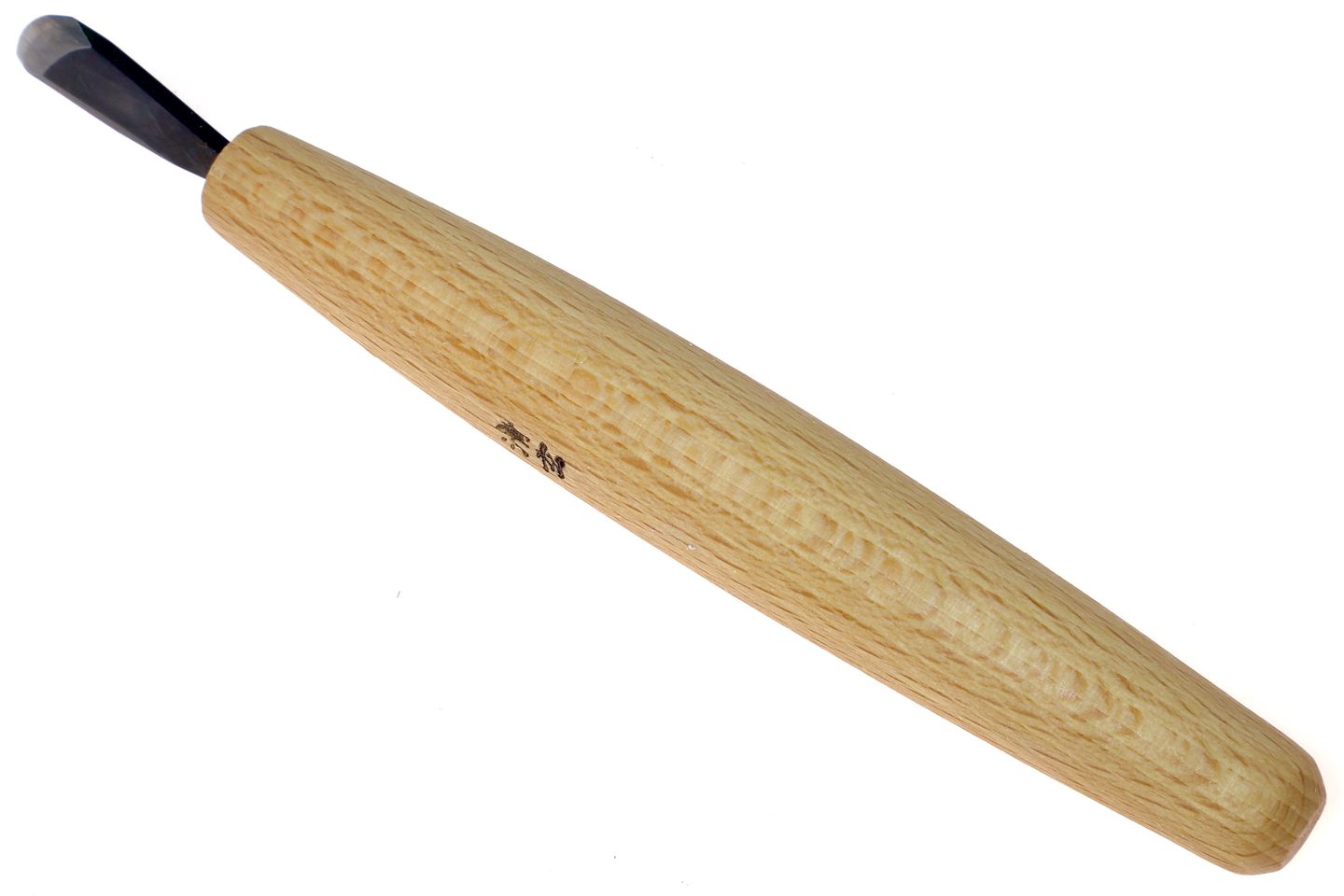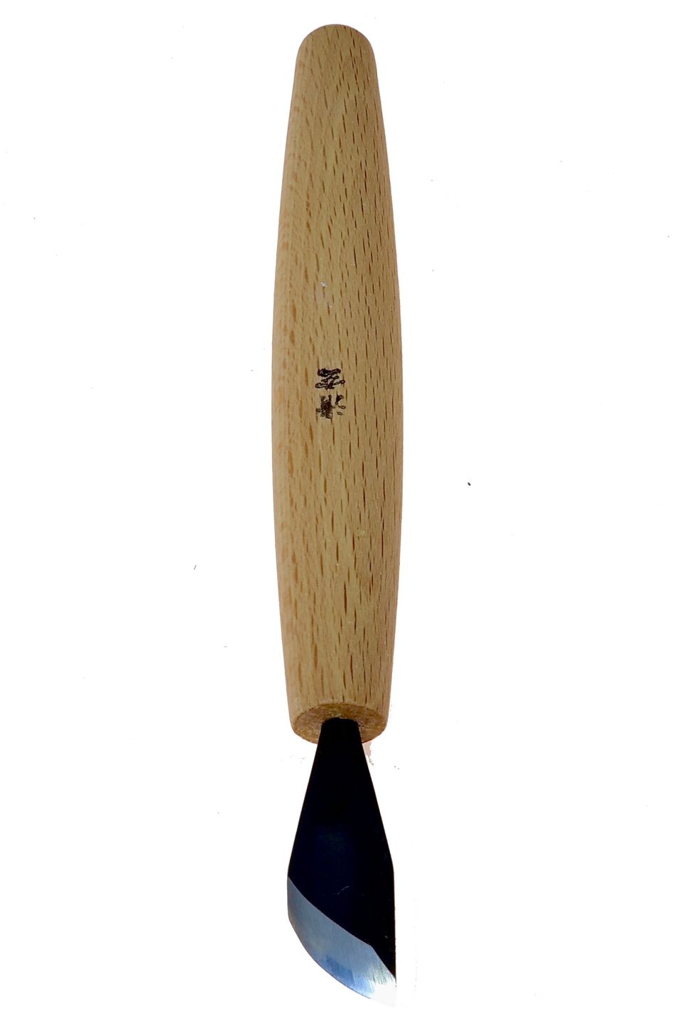 This quality skew corner chisel is forged from blue paper steel (Aogami), a type of Japanese steel with added chromium and tungsten, improving its toughness and wear resistance. This tool has a sharp, rounded skew blade connected to a sturdy wooden handle that is comfortable to grip thanks to its smooth, rounded shape. This skew chisel has a 12mm wide cutting edge, great for smoothing large surfaces and adding fine details with its pointed corner.