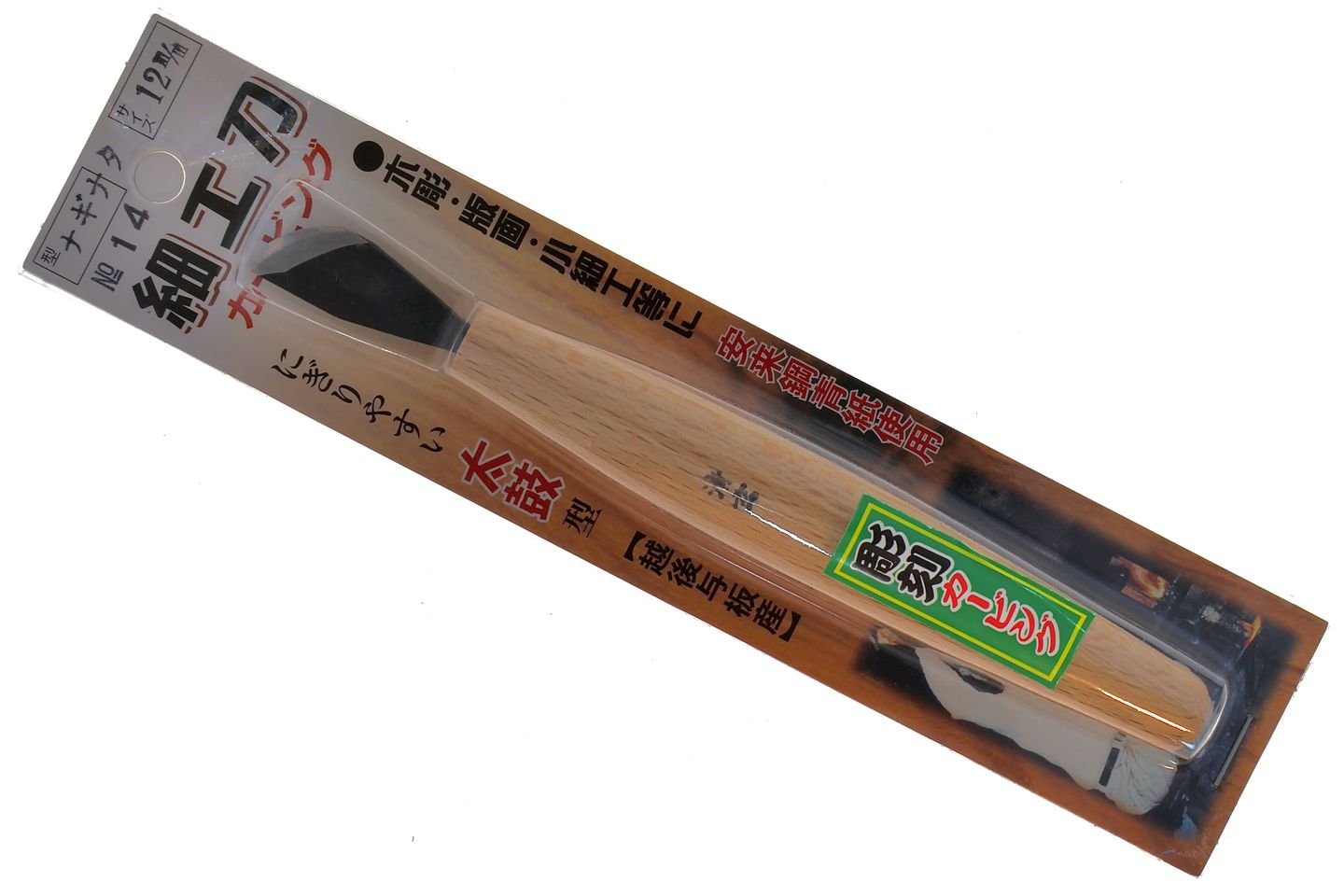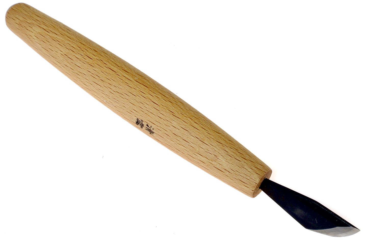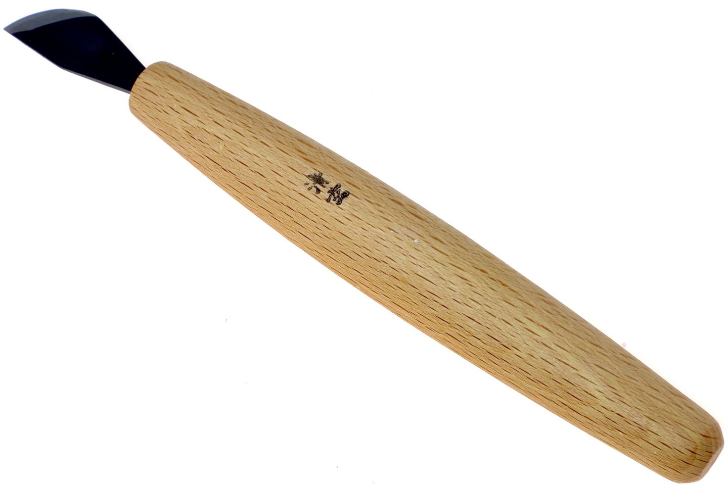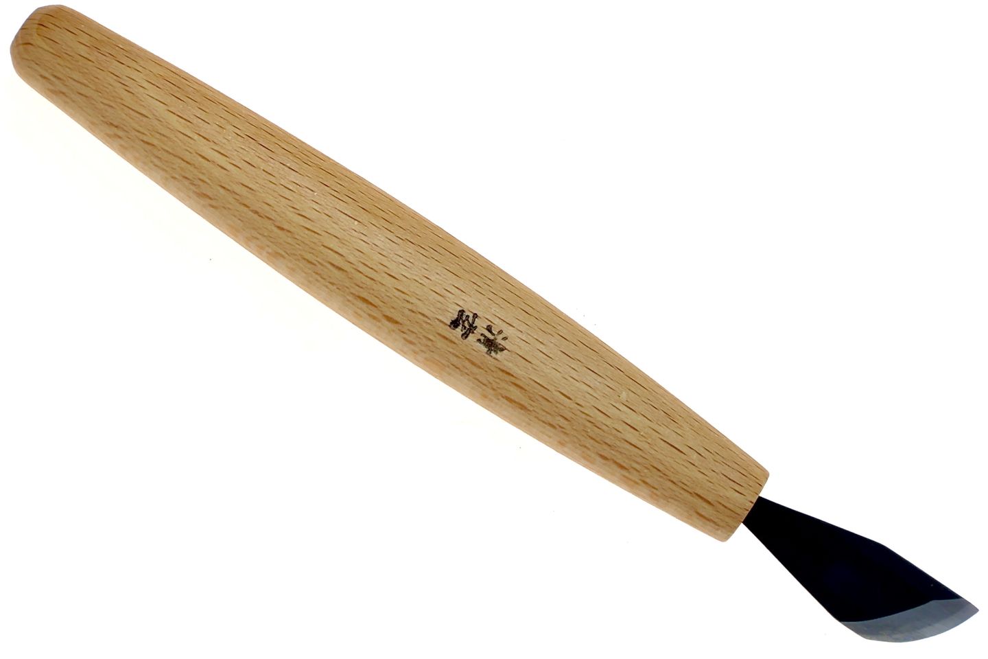 This quality skew corner chisel is forged from blue paper steel (Aogami), a type of Japanese steel with added chromium and tungsten, improving its toughness and wear resistance. This tool has a sharp, rounded skew blade connected to a sturdy wooden handle that is comfortable to grip thanks to its smooth, rounded shape. This skew chisel has a 12mm wide cutting edge, great for smoothing large surfaces and adding fine details with its pointed corner.