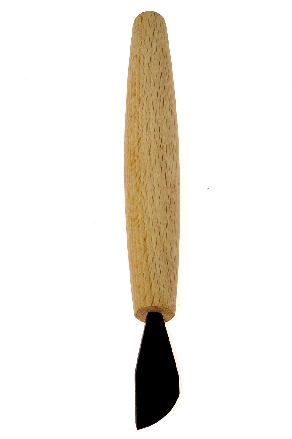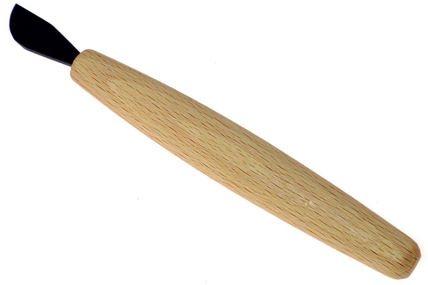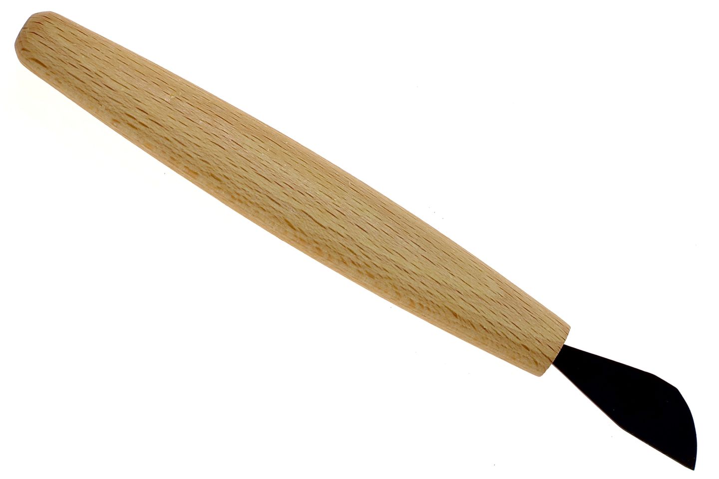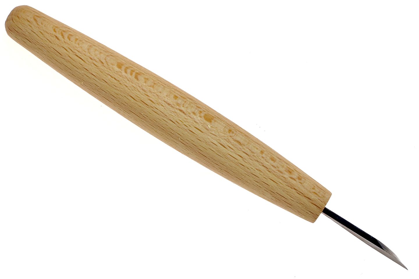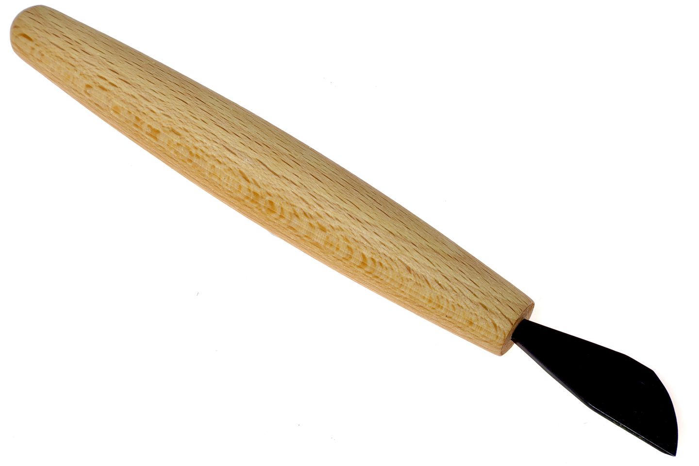 This skew chisel has a rounded cutting edge with a pointed end for carving tapered corners and curved edges in wood that square-ended chisels and gouges cannot reach.