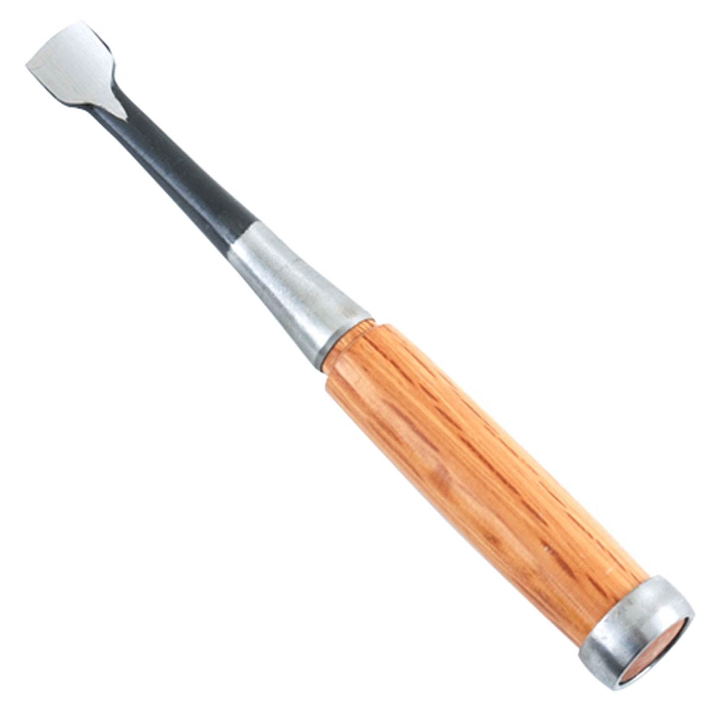 To use, hold the chisel with your non-dominant hand and strike the iron-reinforced end of the handle with a mallet or soft-headed tool. Guide the blade along the wood grain to create clean, accurate cuts, ideal for concave details and other specialised applications.