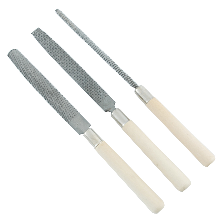 Shape and smooth out wood quickly and efficiently with this set of high-quality woodworking files. This set comes in round, half-round, and flat files, perfect for various wood projects. Each tool is crafted from a solid piece of steel with sharp, raised teeth connected to a sturdy wooden handle, providing a comfortable grip and better control during use.