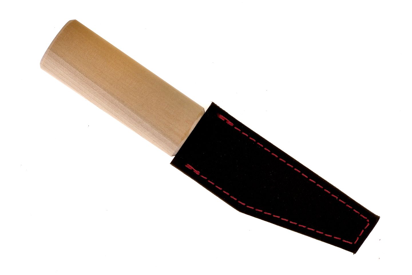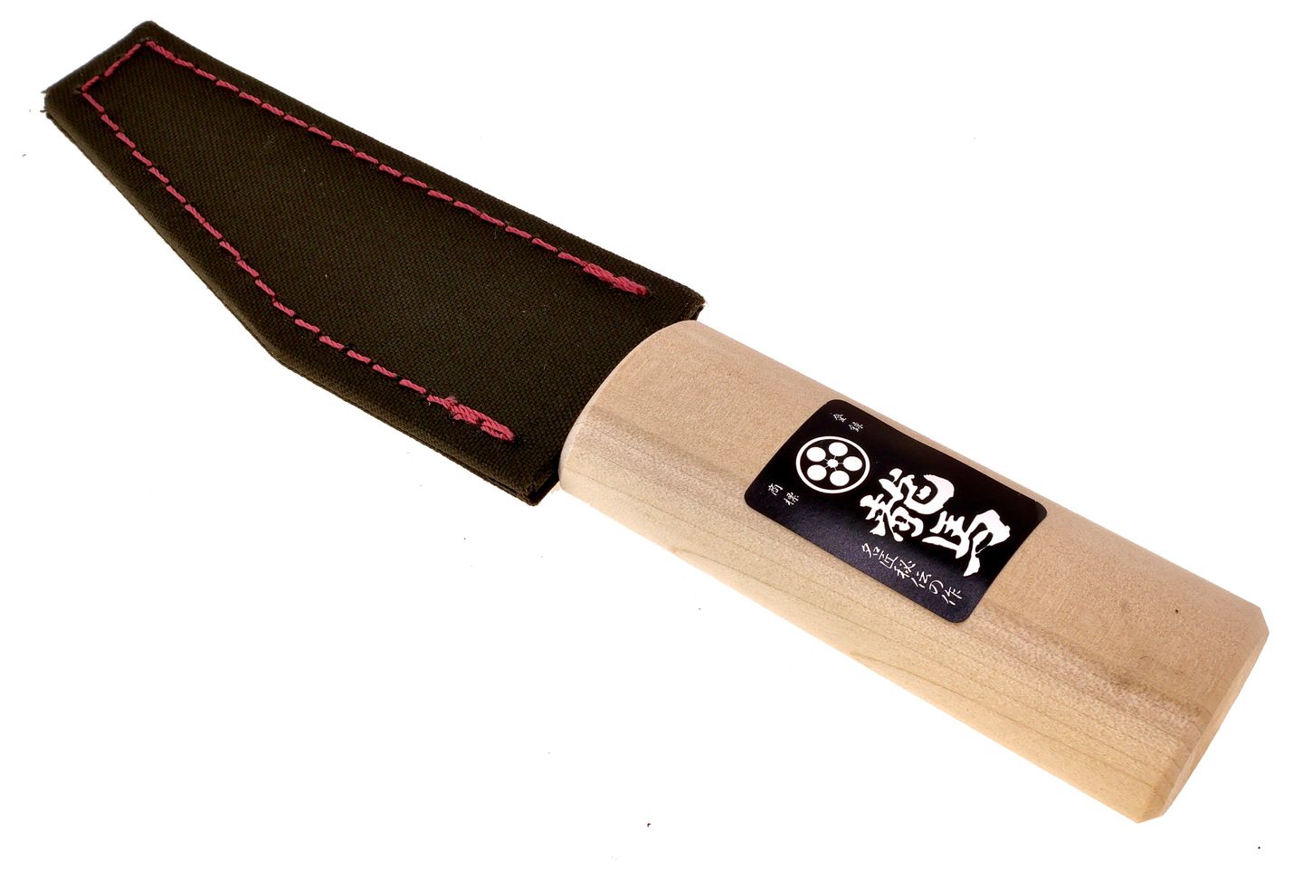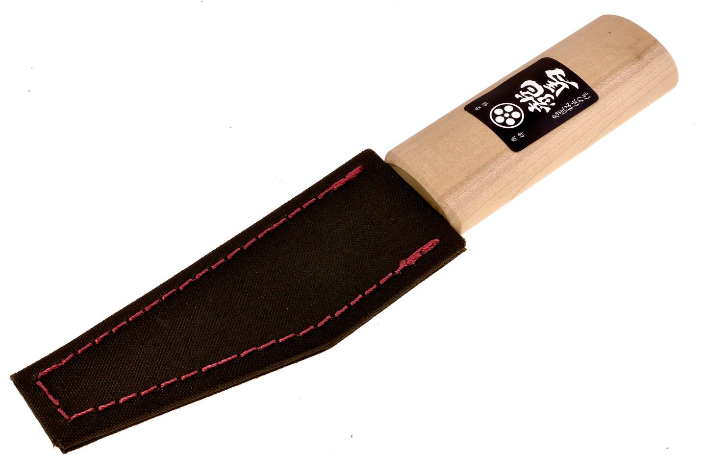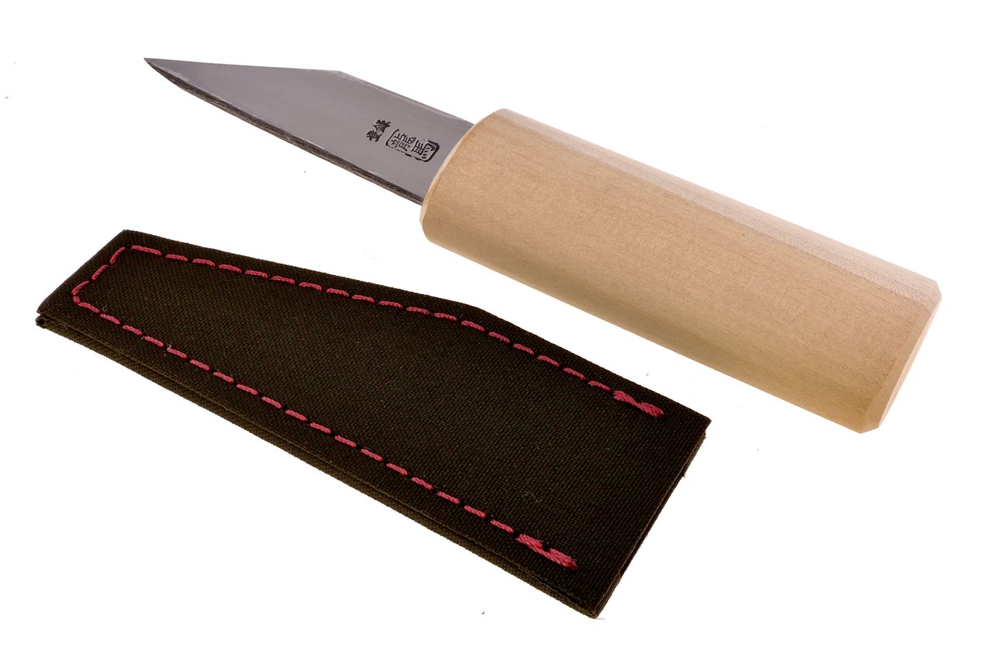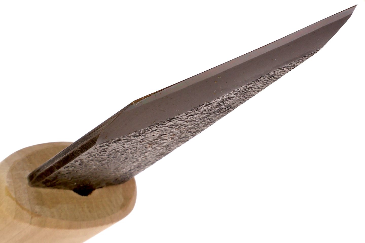 Made for left-handed people, this Japanese yokote knife is not only for whittling and carving wood, but can also be used for bamboo crafts and as a utility knife. This knife has a short wooden handle that makes it easier to control the blade and provides comfort during a long period of use. This tool also includes a fabric sheath to safeguard the blade and avoid any incident when not in use.