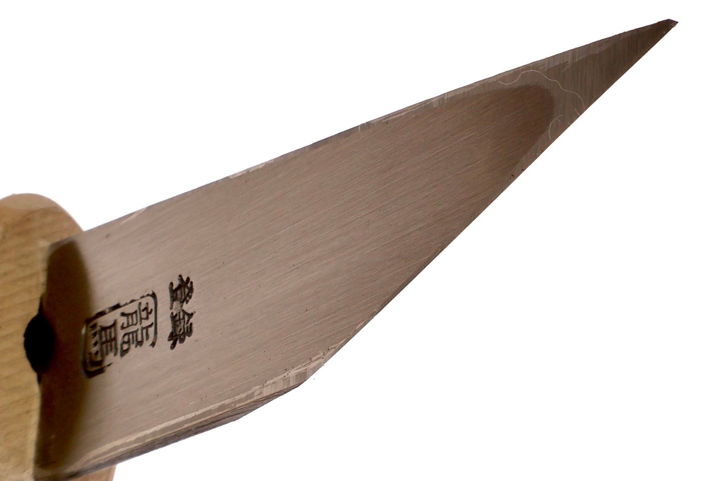 This Japanese yokote knife has a razor-sharp blade that is beveled on one side and has a flat surface on the other side, ideal for precise, detail cutting.