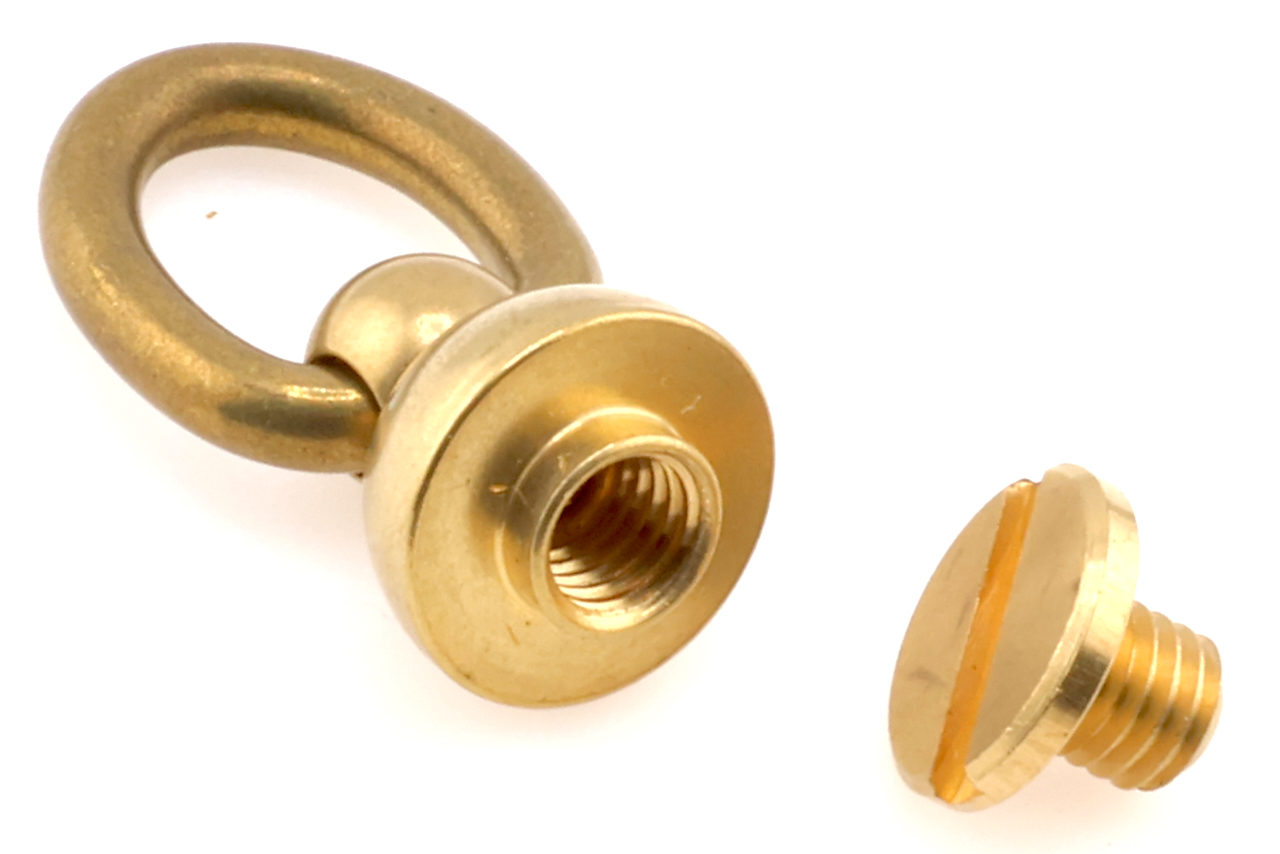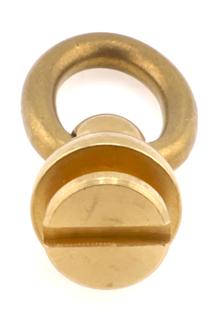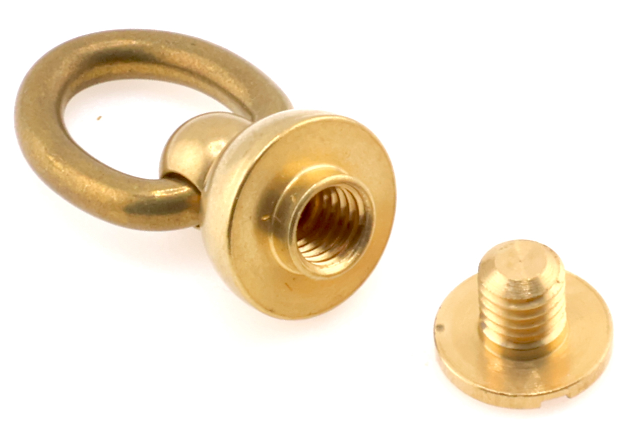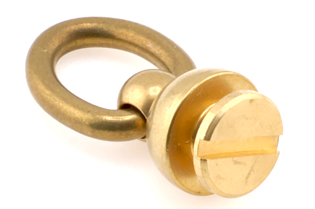 This solid brass loop is perfect for attaching a strap or lanyard loop to your wallet or bag. The total height is 28mm from the base of the screw to the tip of the loop when extended. The height the stud will stand above the leather is 14mm. The loop is 17mm in diameter and can swivel freely and independently of the stud itself both back and forth as well as around in a circle. The diameter of the portion of the stud that will sit in the leather is 6mm in diameter while the screw head is 10mm in diameter. The inside diameter of the loop is 11mm by 9mm at its widest point. This stud is suitable for leather thicker than 2.3mm or thicker.