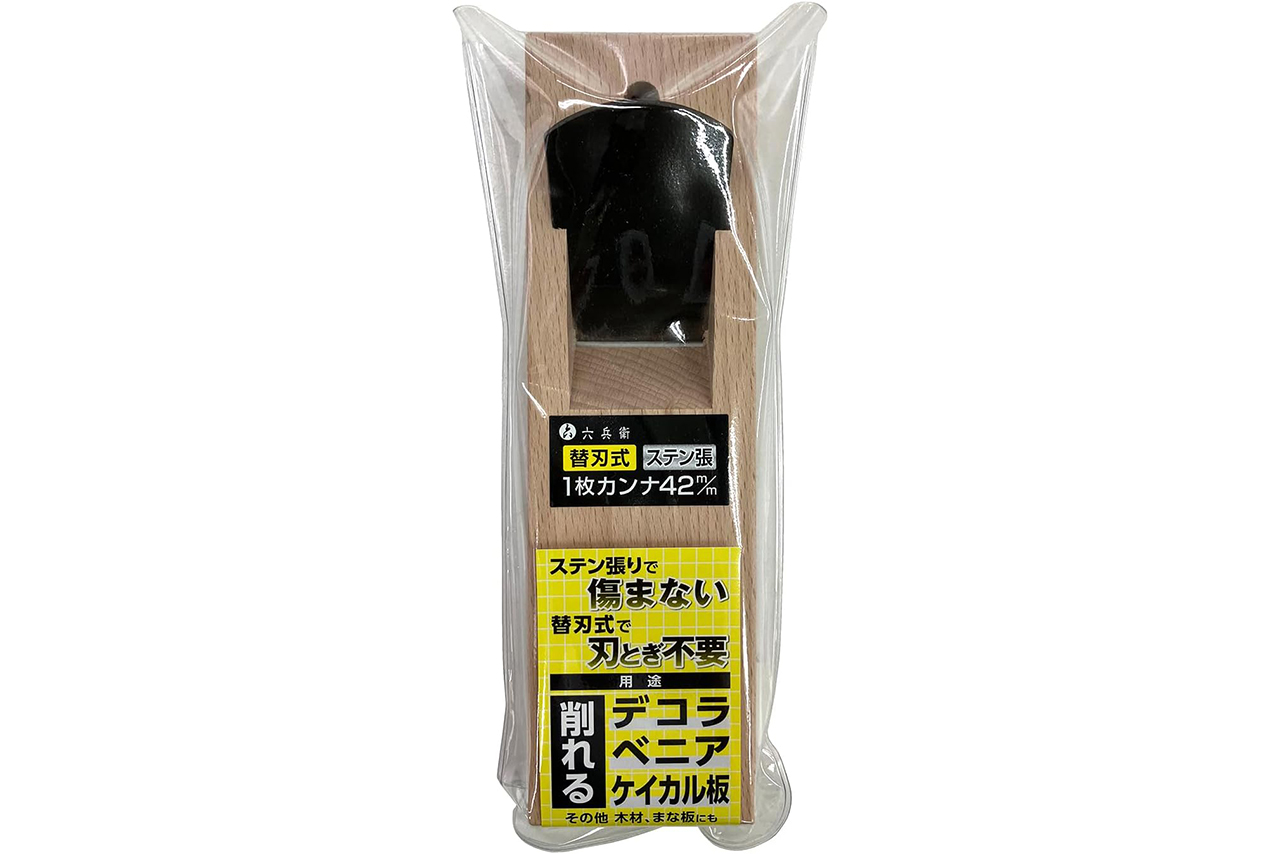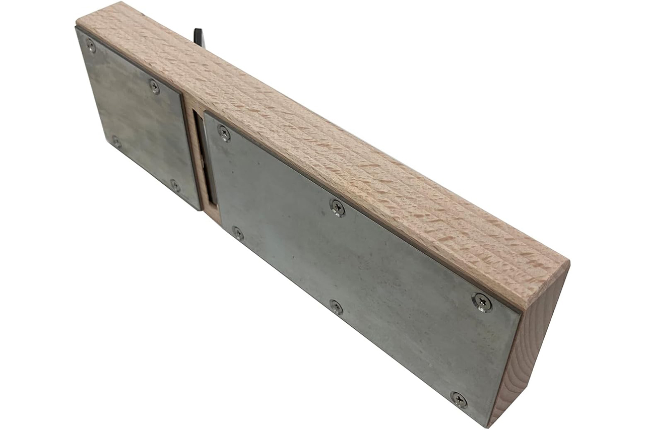 The plane body is made from wood and fitted with a stainless steel sole plate. Traditional kanna rely on a wooden sole that gradually wears during use. On this model, a stainless steel plate is securely attached to the underside of the body with screws, protecting the wooden base from abrasion and helping maintain a flat reference surface. This construction improves durability and helps the plane glide smoothly across the workpiece while maintaining consistent shaving performance.