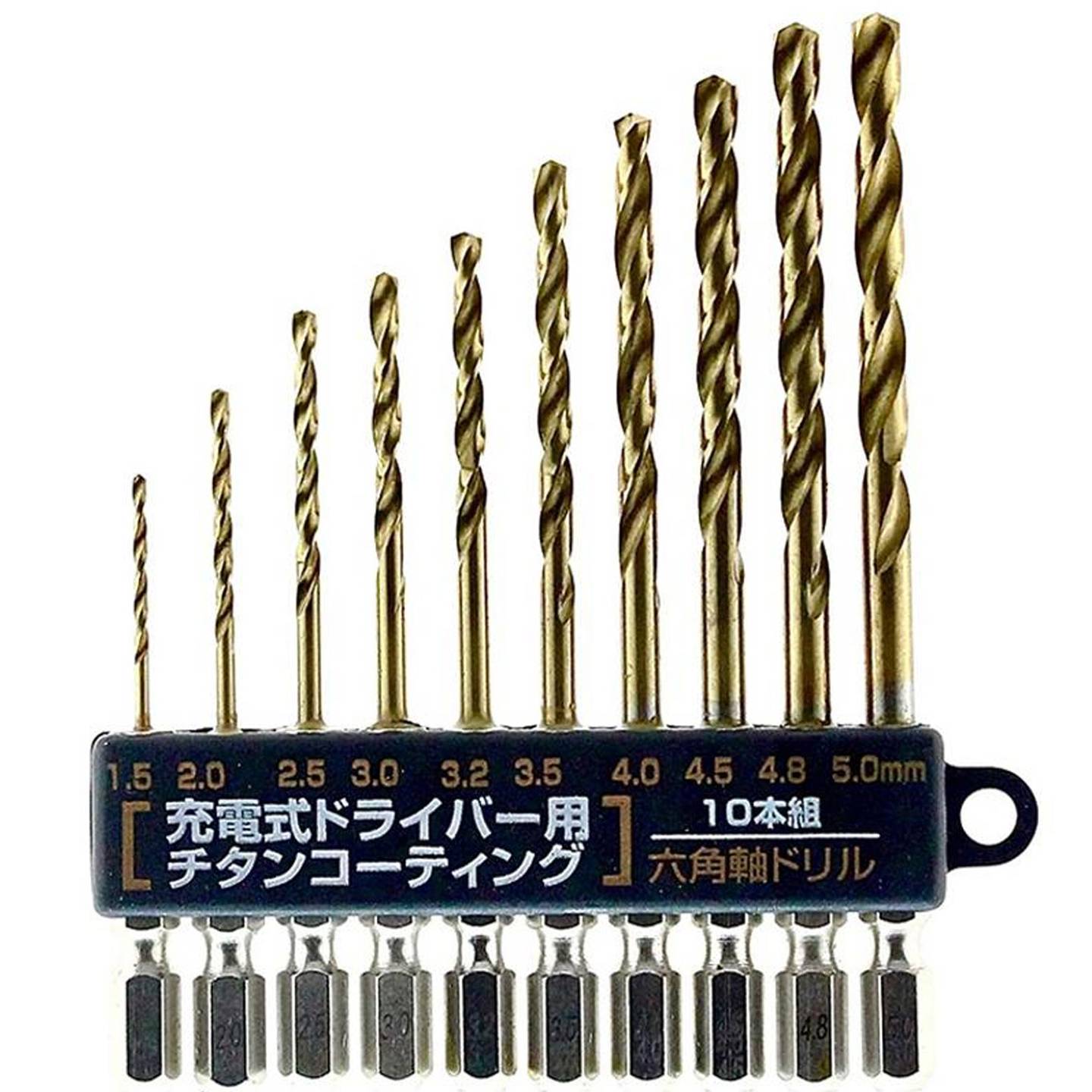 Yoitariki 10-Piece 1.5mm~5.0mm Hexagon Titanium Coated Drill Bit Set, with Hexagonal Shaft, for Ironwork, Light Metals, Wood, Resin